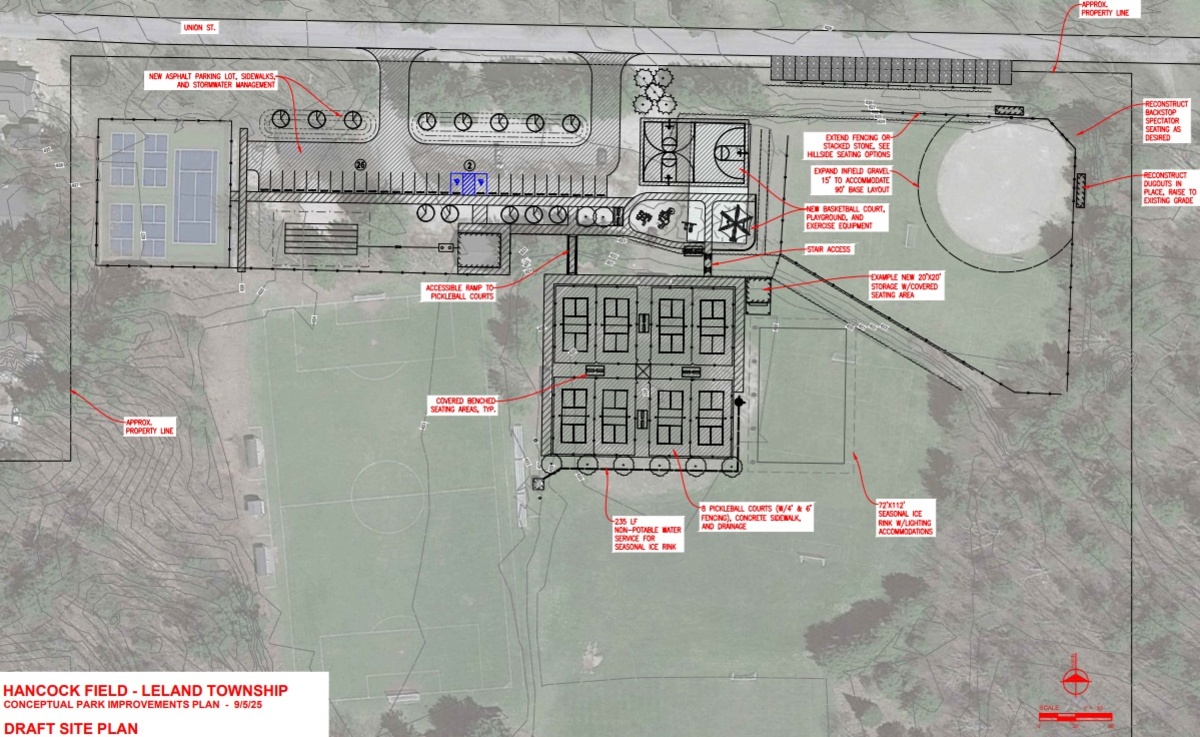 Leland Township and Leland Public School continue to finalize plans for Hancock Recreational Area (often called Hancock Field or Park), a roughly 13-acre parcel near the Leland Country Club. Both entities are involved because township owns the property, but the school leases it and has used it for various programs (most notably soccer) for many years.