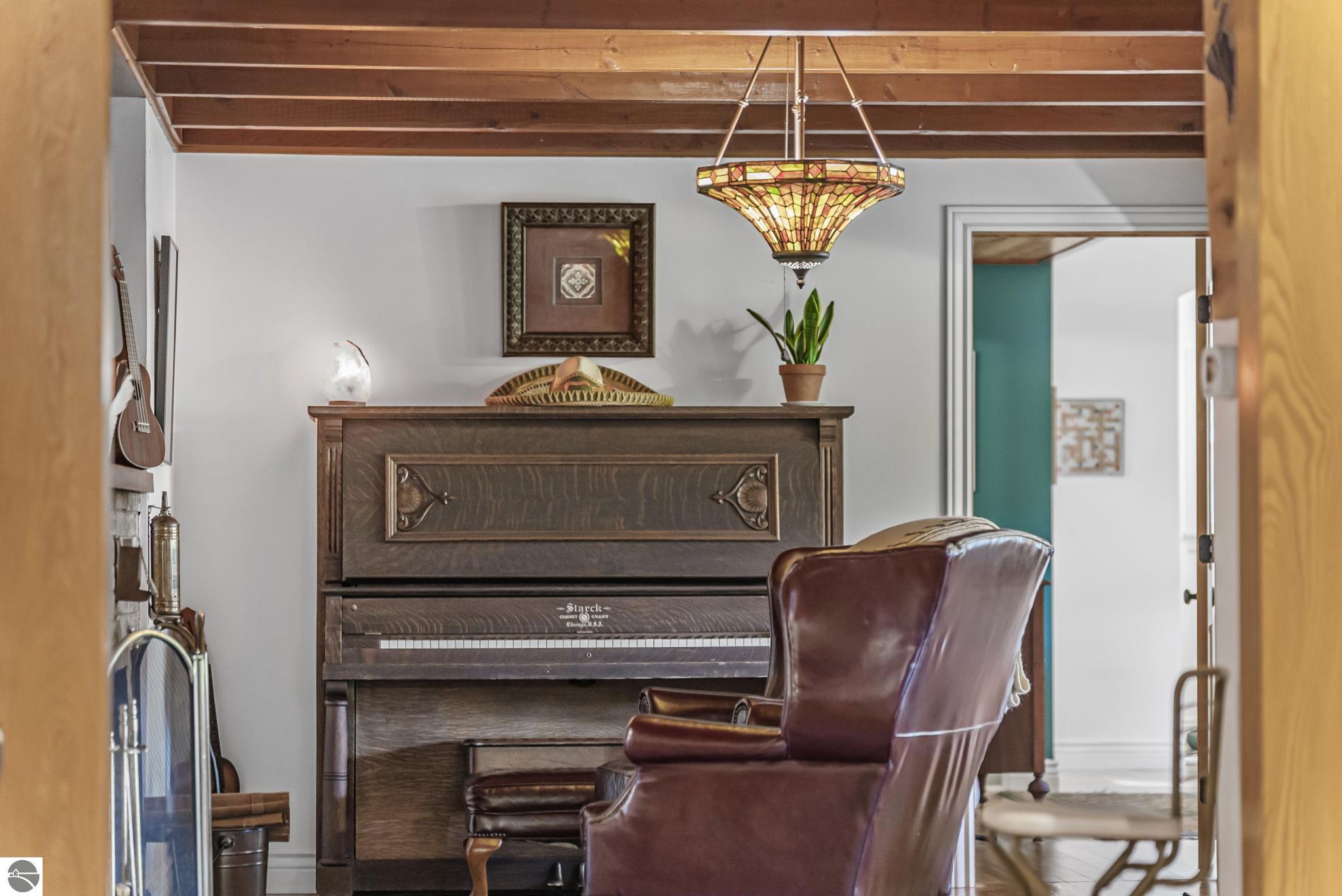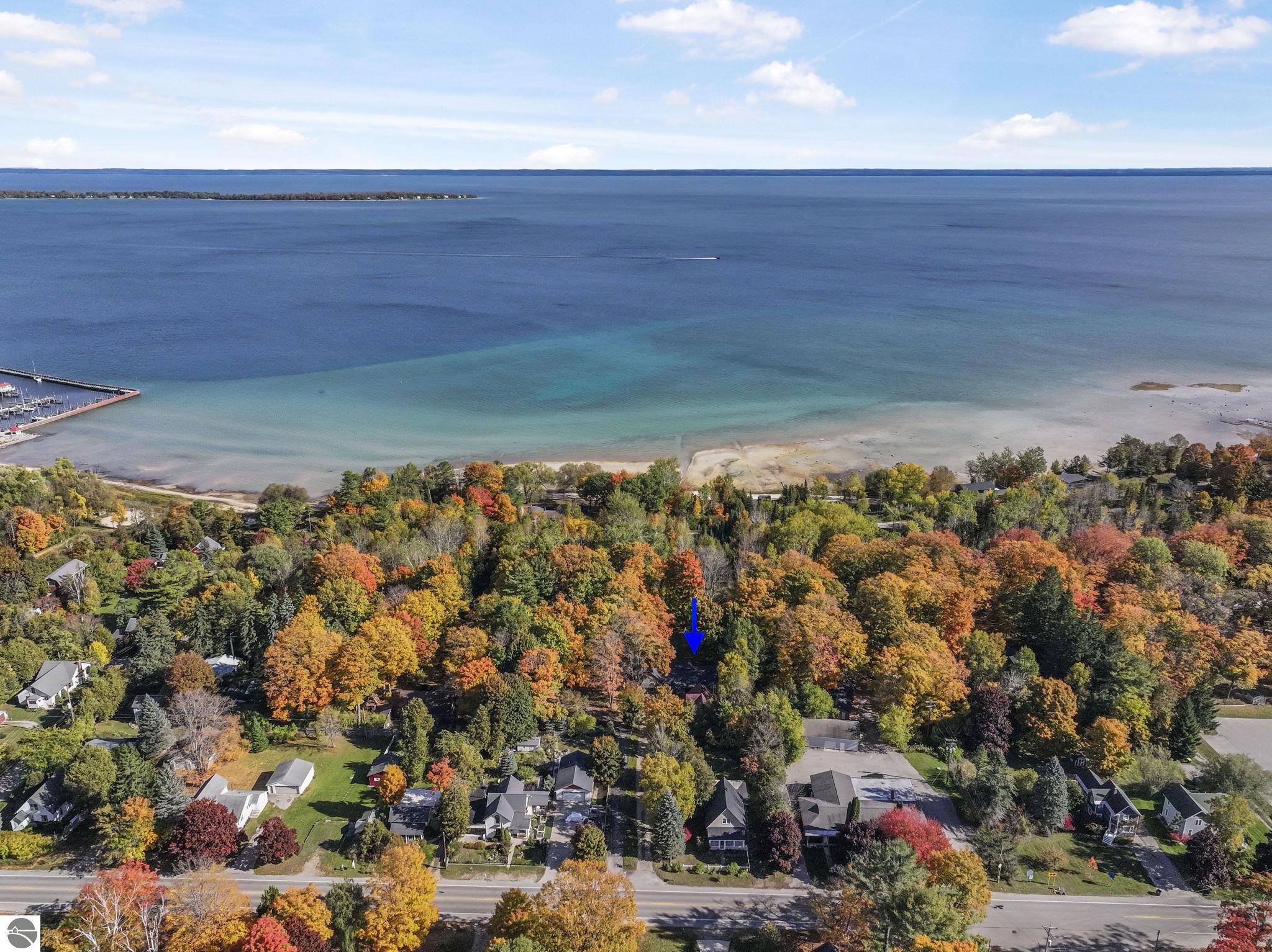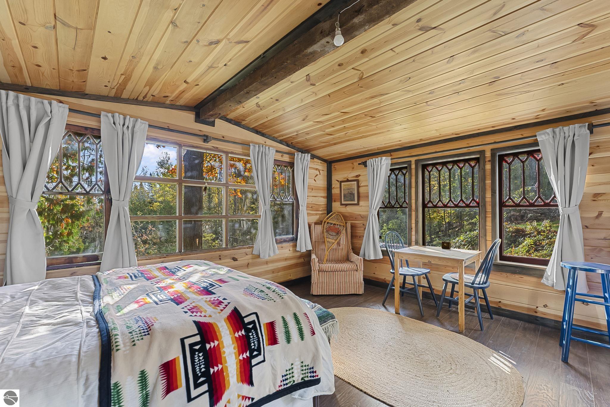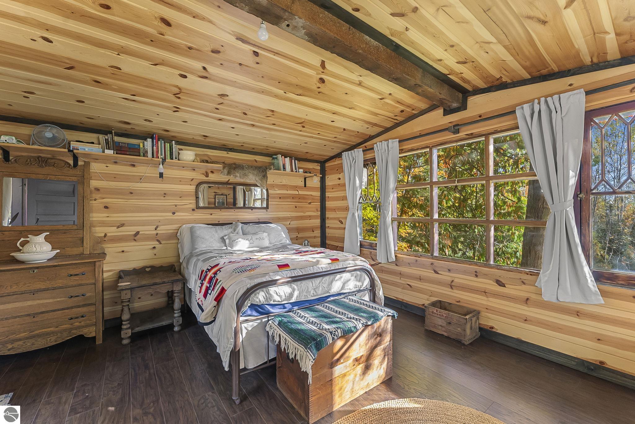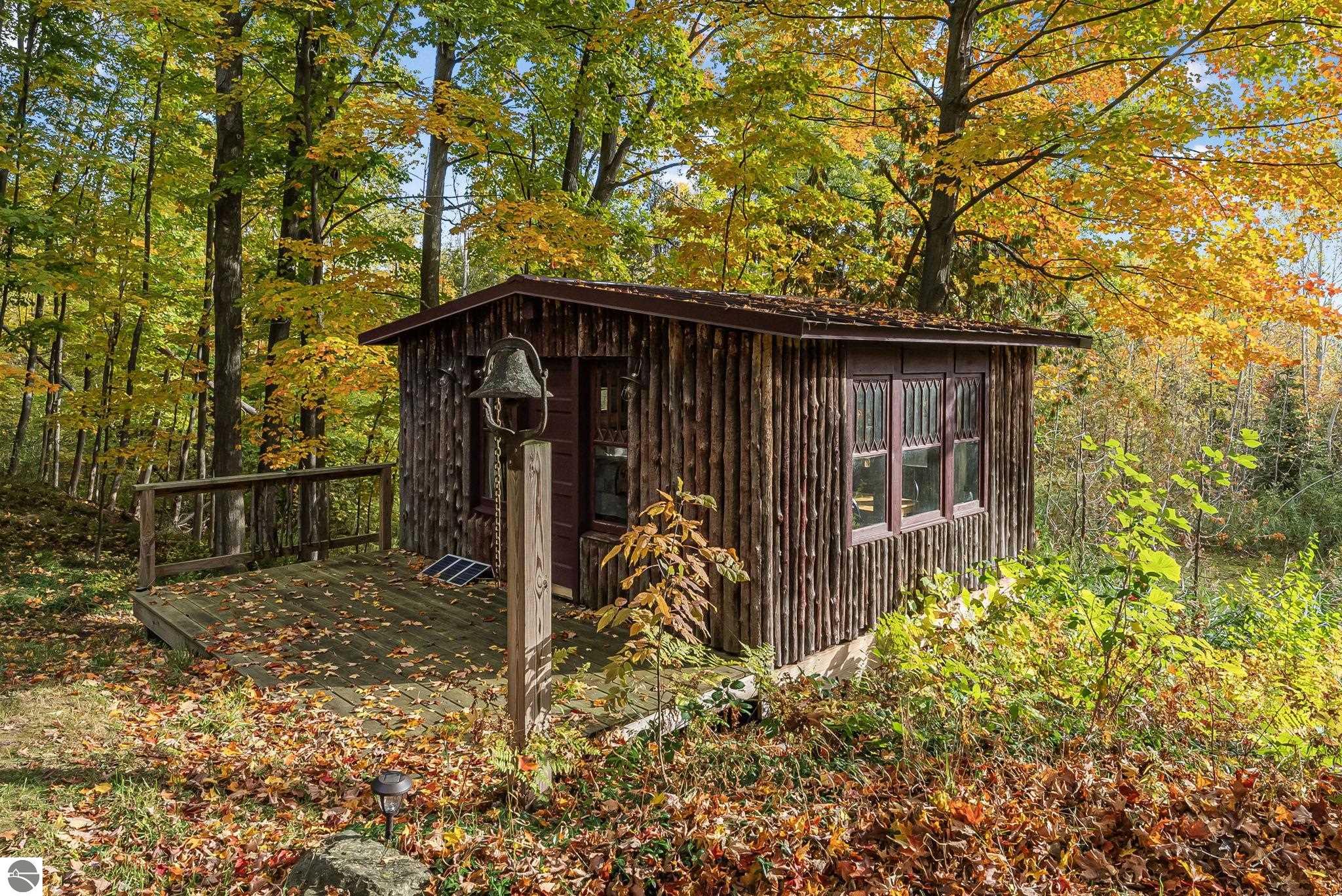 One of Northport’s true hidden gems. Village conveniences are just moments away—walk or golf cart to beaches, grocery, the farmers market, boutiques, live music, and dining—yet this 1.5-acre property feels worlds apart. Enjoy beautiful Grand Traverse Bay views (tree management under your control, enhancing your year-round views) and rare access to South Shore Drive, all while tucked away from road noise and activity. Designed for main-level living, the home features two ensuite bedrooms, two living areas, a vaulted great room with gas fireplace, and a bright sunroom off the dining area with brick fireplace, exposed beams, and oak floors. Character is not missed here—you’ll find wood-accented ceilings and floors, stunning closets with charming porthole details, unique rooflines, and oversized storage spaces that make this home both functional and full of personality. An oversized garage framed for expansion, matching garden building, and authentic log cabin add flexibility and charm. The cabin offers space for guests, an artist’s retreat, or creative hideaway. Custom woodworking and vintage details throughout both the home and cabin make this a standout Northport property, blending village convenience with timeless Up North appeal.