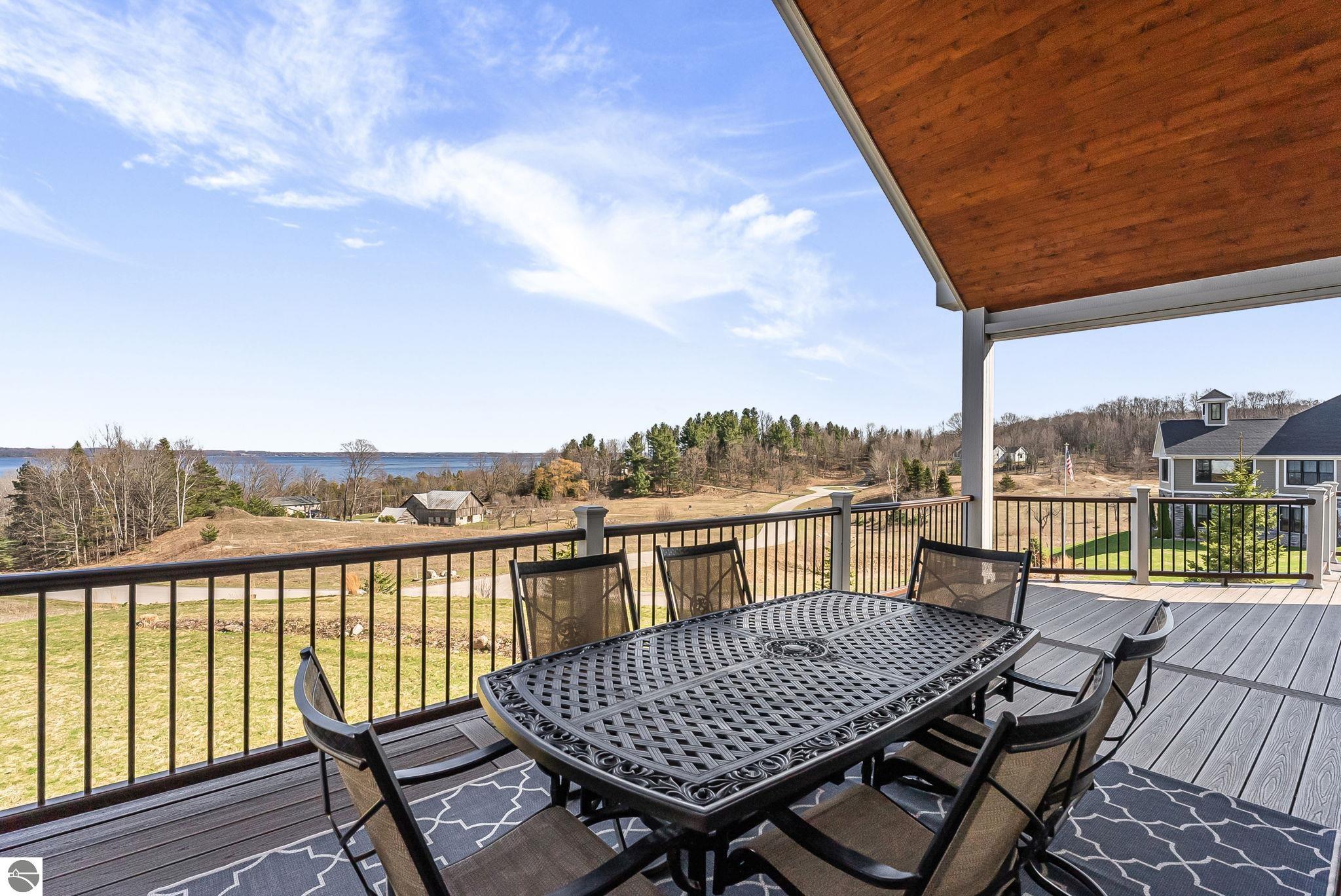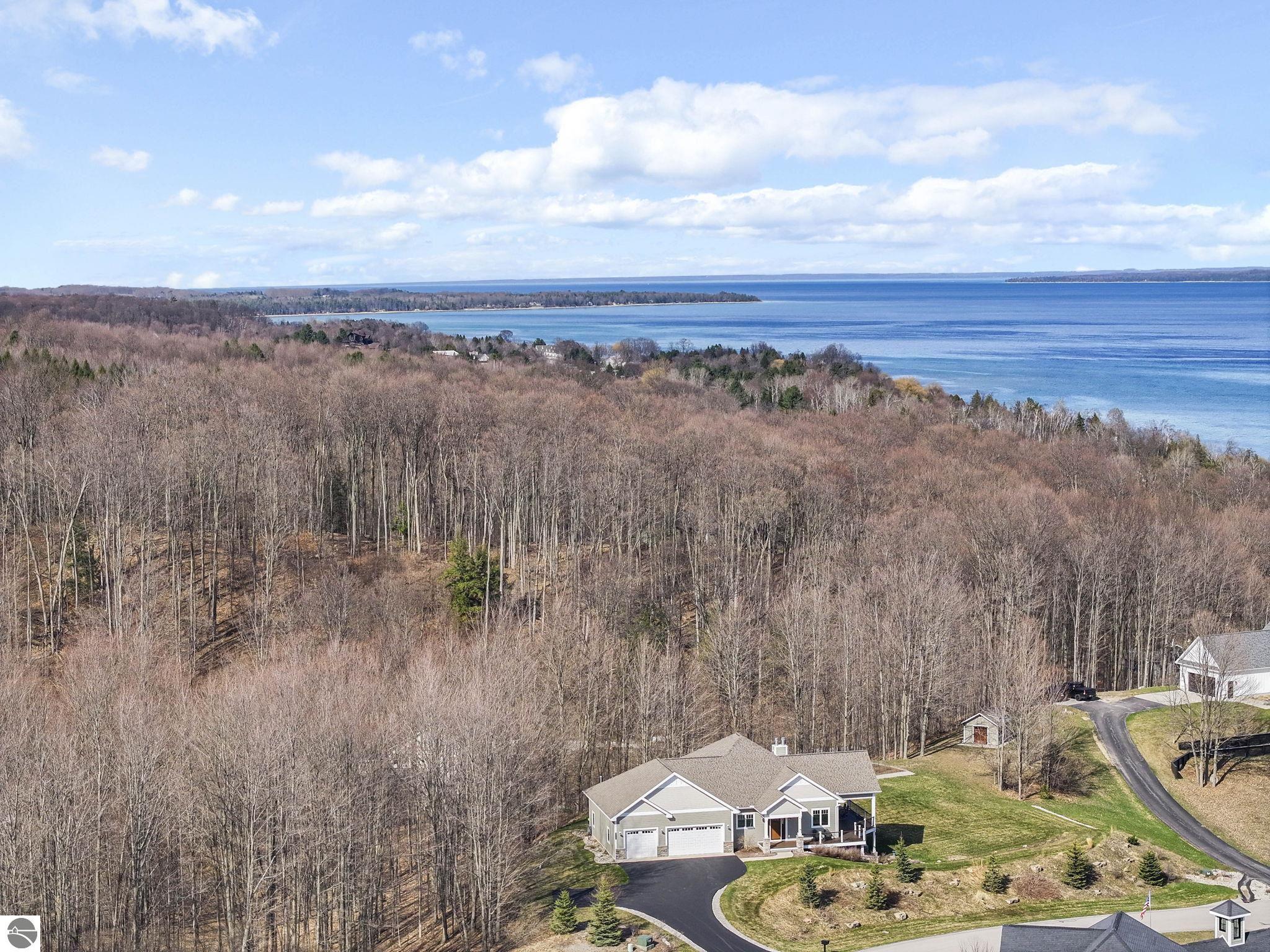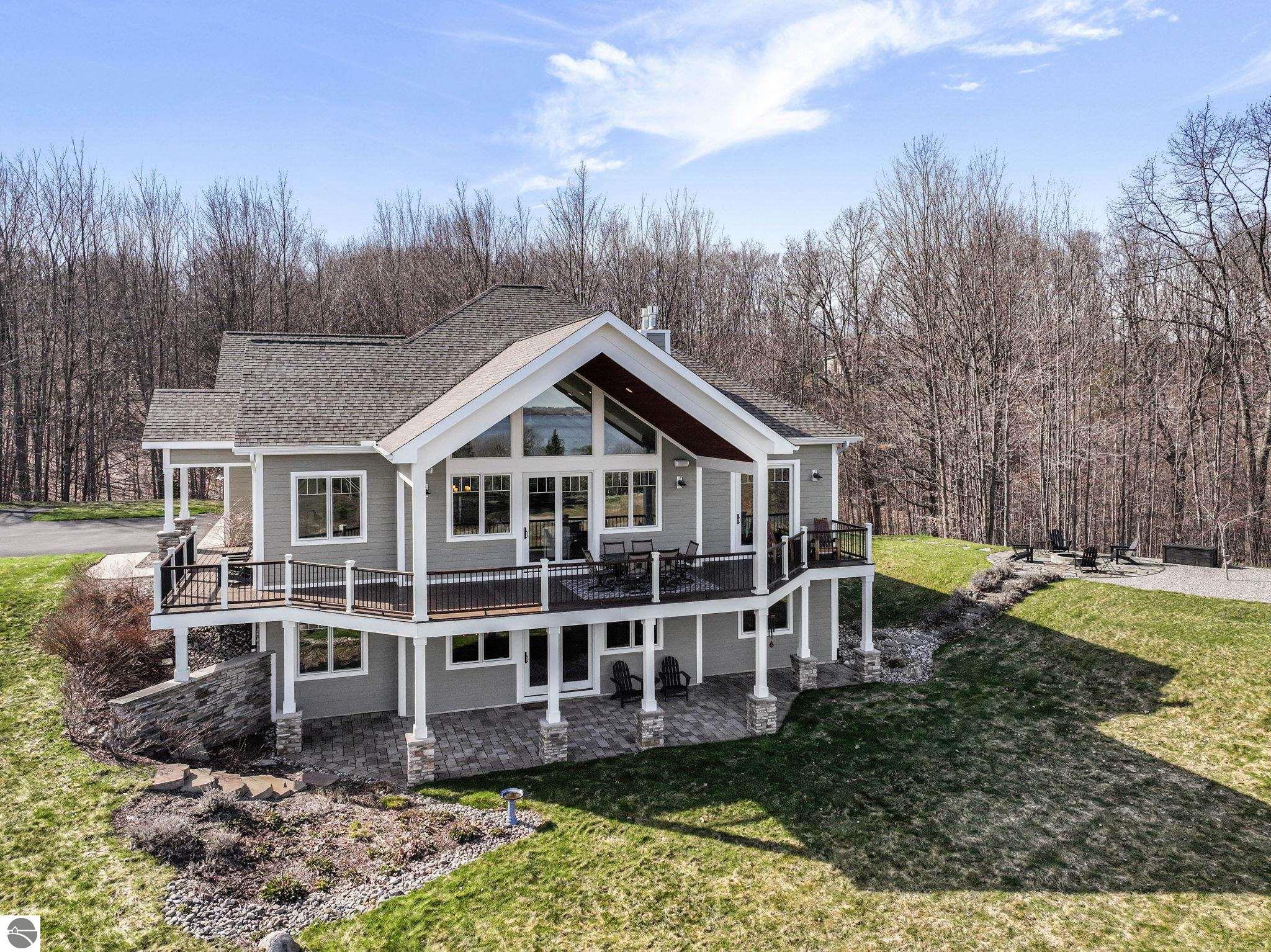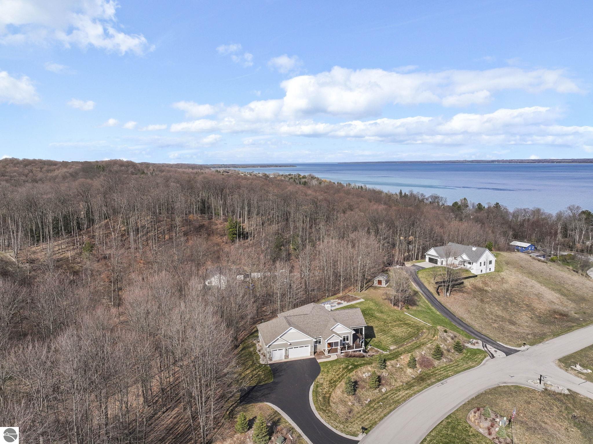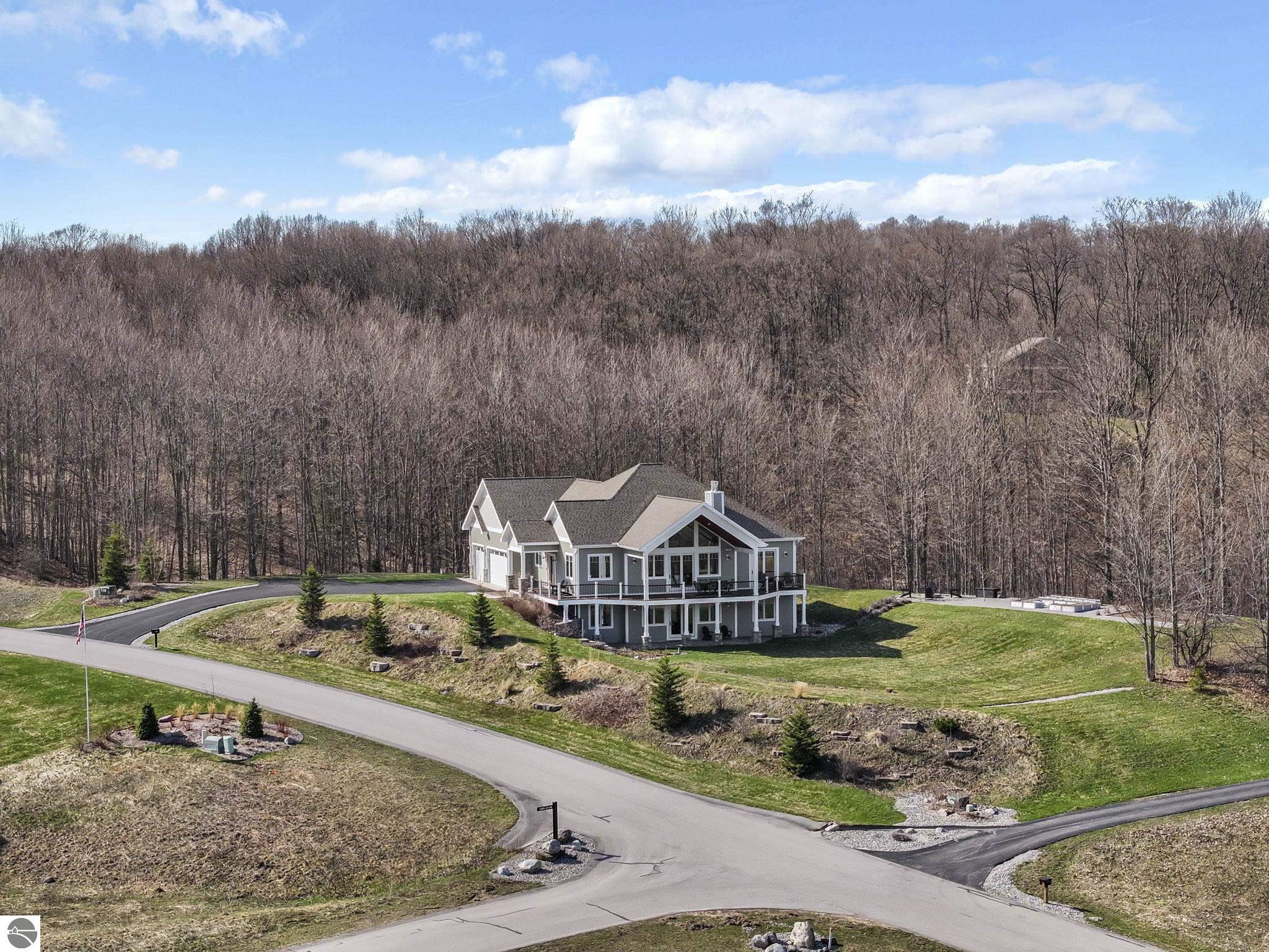 Breathtaking, unobstructed panoramic views of West Grand Traverse Bay and Power Island are showcased from the main living areas and all bedrooms in this custom Up North luxury home, ideally located just 10 minutes from Traverse City and Suttons Bay. Located in the sought-after Rolling Hills Estates subdivision, known for its collection of custom homes on spacious, well-appointed lots, the property offers convenient access to wineries, restaurants, breweries, and the Tart Trail. Situated on a 1.44-acre double parcel, the home features extensive professional landscaping representing a significant investment in thoughtfully designed outdoor living. Enjoy an immense wraparound Trex deck with privacy screen, a custom fire pit gathering area, and a beautiful paver patio off the walkout lower level, all positioned to take full advantage of the expansive bay views. The open-concept main level features vaulted shiplap ceilings with beams, expansive windows, hardwood flooring, and a chef’s kitchen with custom cabinetry, quartz countertops, and a walk-in pantry. Two gas fireplaces, located in the main living area and lower-level family room, provide warmth and ambiance. A fully integrated Control4 smart home system operates motorized blinds, lighting, sound, security system with cameras, thermostats, and garage doors. The walkout lower level includes a family room with surround sound, kitchenette, wine room, office, and three additional bedrooms, all designed to maximize comfort and flexibility. The home offers two en-suite bedrooms, including a main-level primary suite with a freestanding tub, walk-in shower, and heated floors, with heated floors also featured in the additional en-suite bath. The heated garage is fully finished with epoxy flooring, custom built-ins, and detailed trim work, plus hot and cold water. Additional features include Hardie Plank siding, Pella casement windows, dual-zone furnace, Generac, and a 12x14 custom shed. Measurements are estimated.