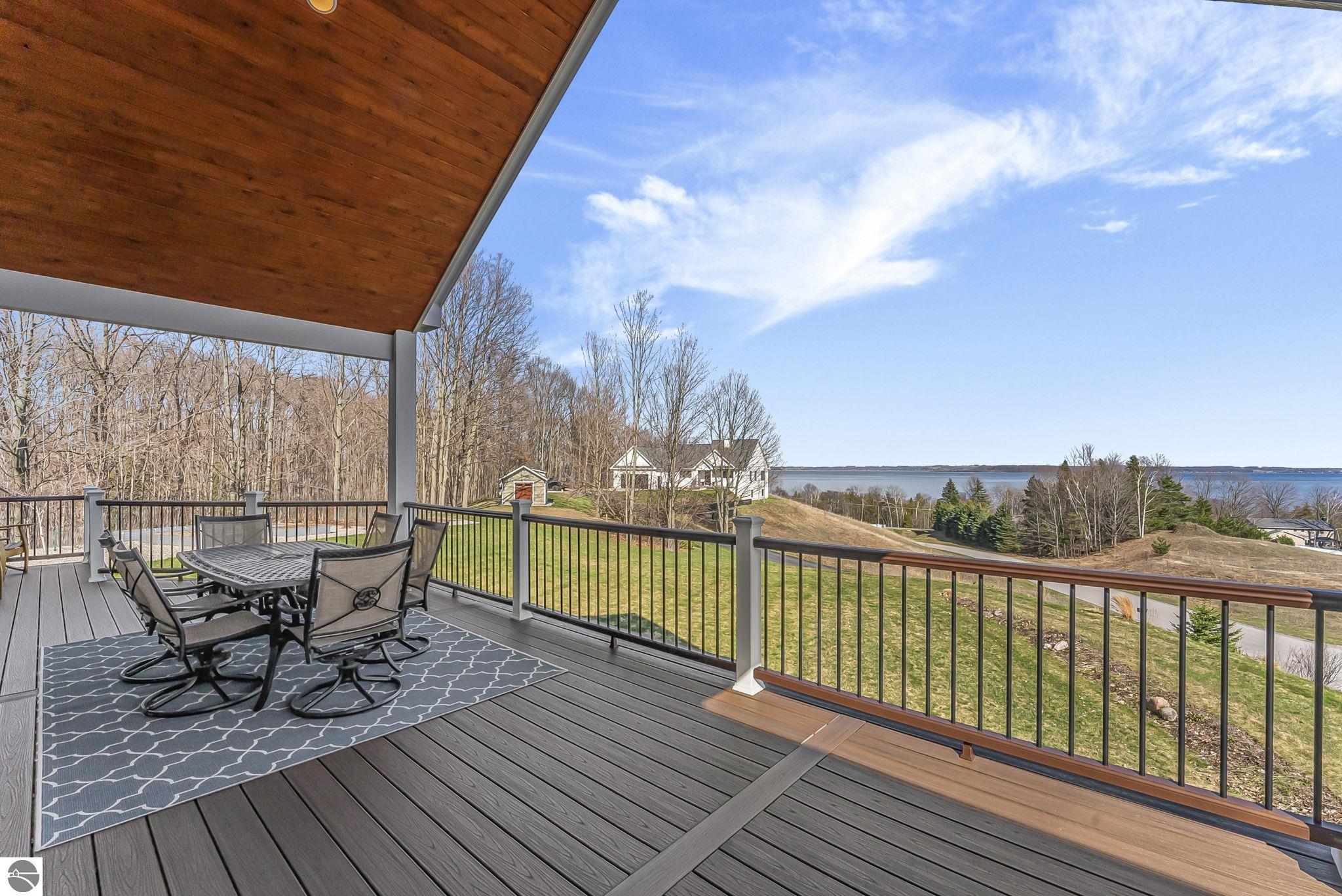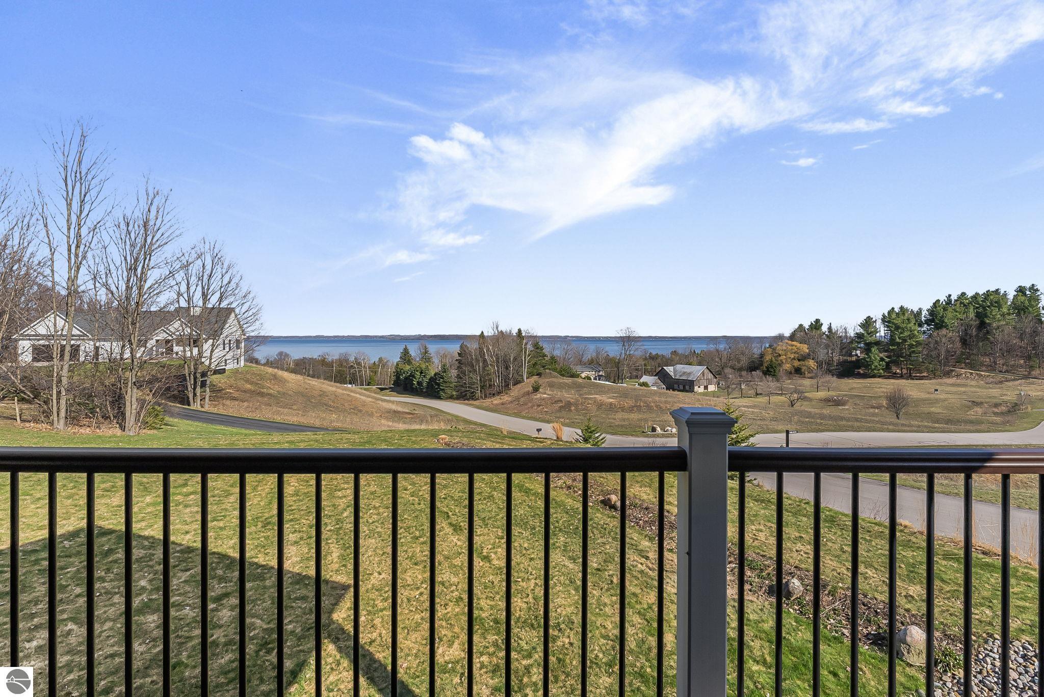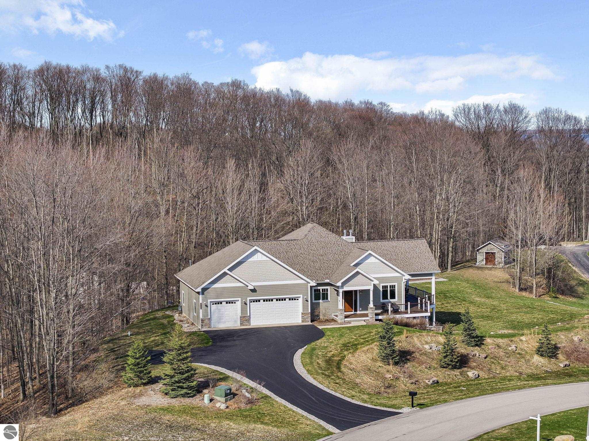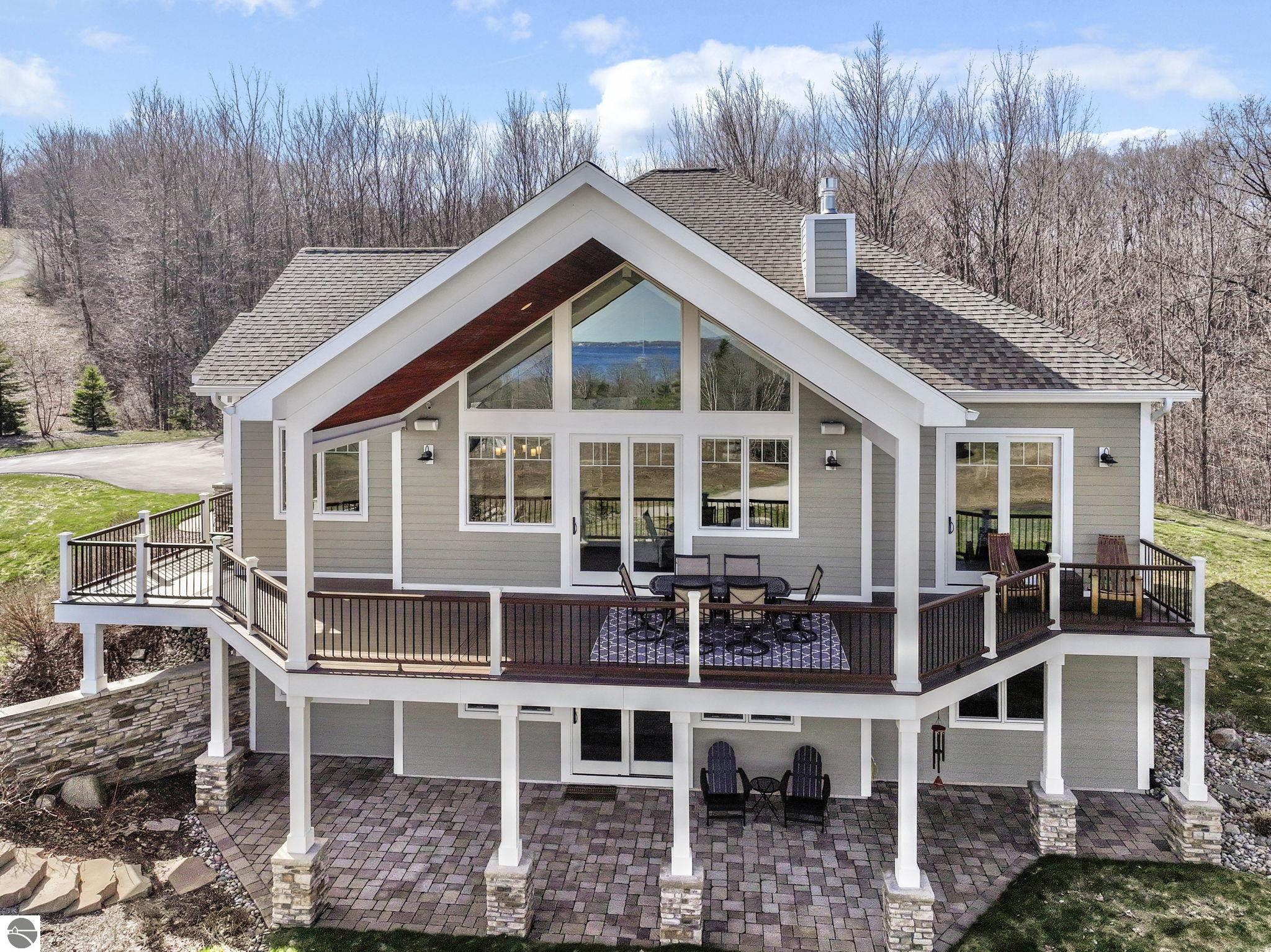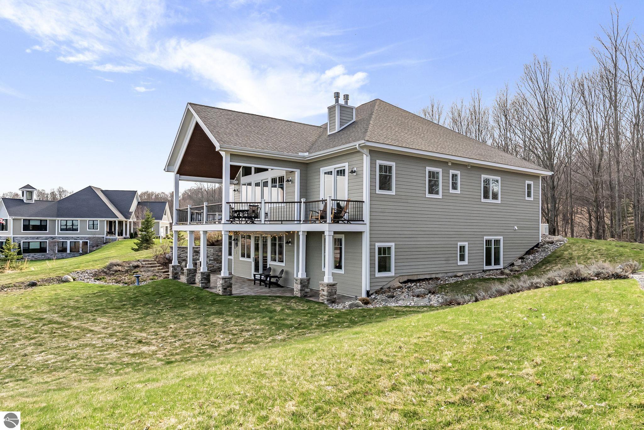 Breathtaking, unobstructed panoramic views of West Grand Traverse Bay and Power Island are showcased from the main living areas and all bedrooms in this custom Up North luxury home, ideally located just 10 minutes from Traverse City and Suttons Bay. Located in the sought-after Rolling Hills Estates subdivision, known for its collection of custom homes on spacious, well-appointed lots, the property offers convenient access to wineries, restaurants, breweries, and the Tart Trail. Situated on a 1.44-acre double parcel, the home features extensive professional landscaping representing a significant investment in thoughtfully designed outdoor living. Enjoy an immense wraparound Trex deck with privacy screen, a custom fire pit gathering area, and a beautiful paver patio off the walkout lower level, all positioned to take full advantage of the expansive bay views. The open-concept main level features vaulted shiplap ceilings with beams, expansive windows, hardwood flooring, and a chef’s kitchen with custom cabinetry, quartz countertops, and a walk-in pantry. Two gas fireplaces, located in the main living area and lower-level family room, provide warmth and ambiance. A fully integrated Control4 smart home system operates motorized blinds, lighting, sound, security system with cameras, thermostats, and garage doors. The walkout lower level includes a family room with surround sound, kitchenette, wine room, office, and three additional bedrooms, all designed to maximize comfort and flexibility. The home offers two en-suite bedrooms, including a main-level primary suite with a freestanding tub, walk-in shower, and heated floors, with heated floors also featured in the additional en-suite bath. The heated garage is fully finished with epoxy flooring, custom built-ins, and detailed trim work, plus hot and cold water. Additional features include Hardie Plank siding, Pella casement windows, dual-zone furnace, Generac, and a 12x14 custom shed. Measurements are estimated.