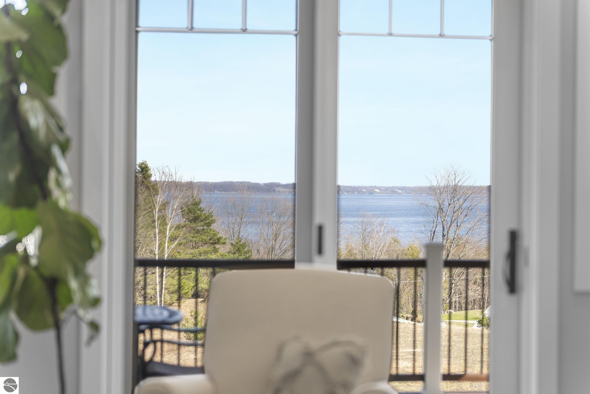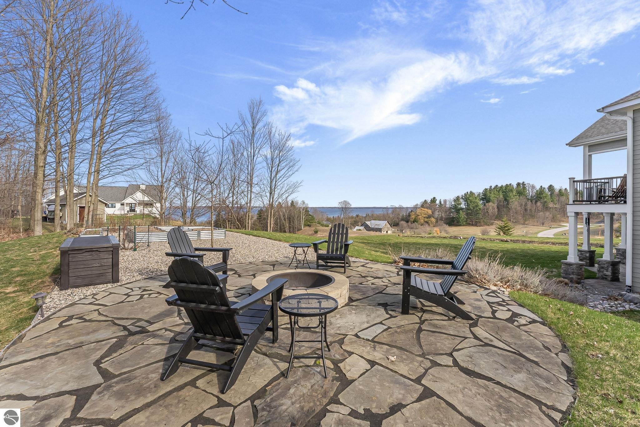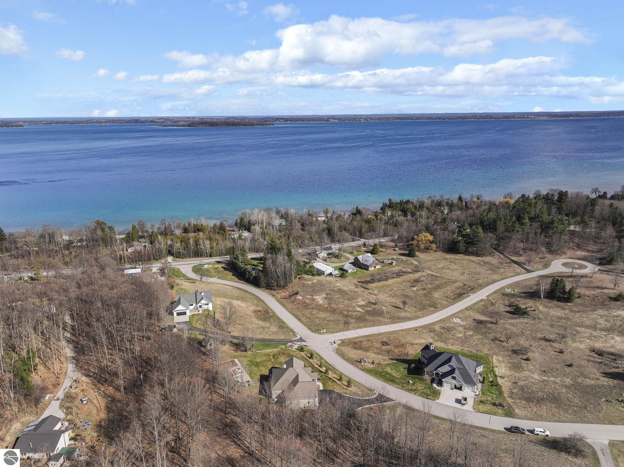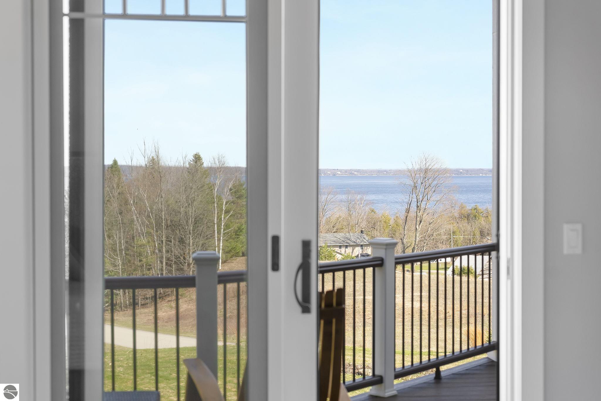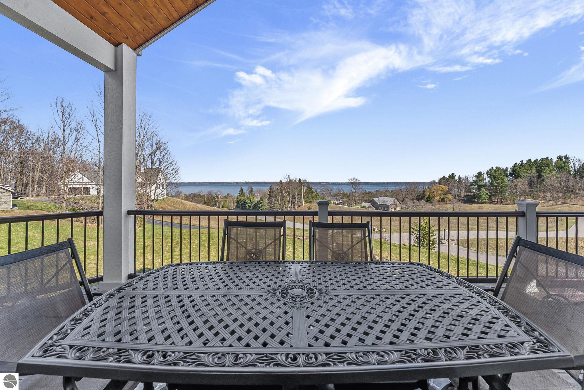 Breathtaking, unobstructed panoramic views of West Grand Traverse Bay and Power Island are showcased from the main living areas and all bedrooms in this custom Up North luxury home, ideally located just 10 minutes from Traverse City and Suttons Bay. Located in the sought-after Rolling Hills Estates subdivision, known for its collection of custom homes on spacious, well-appointed lots, the property offers convenient access to wineries, restaurants, breweries, and the Tart Trail. Situated on a 1.44-acre double parcel, the home features extensive professional landscaping representing a significant investment in thoughtfully designed outdoor living. Enjoy an immense wraparound Trex deck with privacy screen, a custom fire pit gathering area, and a beautiful paver patio off the walkout lower level, all positioned to take full advantage of the expansive bay views. The open-concept main level features vaulted shiplap ceilings with beams, expansive windows, hardwood flooring, and a chef’s kitchen with custom cabinetry, quartz countertops, and a walk-in pantry. Two gas fireplaces, located in the main living area and lower-level family room, provide warmth and ambiance. A fully integrated Control4 smart home system operates motorized blinds, lighting, sound, security system with cameras, thermostats, and garage doors. The walkout lower level includes a family room with surround sound, kitchenette, wine room, office, and three additional bedrooms, all designed to maximize comfort and flexibility. The home offers two en-suite bedrooms, including a main-level primary suite with a freestanding tub, walk-in shower, and heated floors, with heated floors also featured in the additional en-suite bath. The heated garage is fully finished with epoxy flooring, custom built-ins, and detailed trim work, plus hot and cold water. Additional features include Hardie Plank siding, Pella casement windows, dual-zone furnace, Generac, and a 12x14 custom shed. Measurements are estimated.