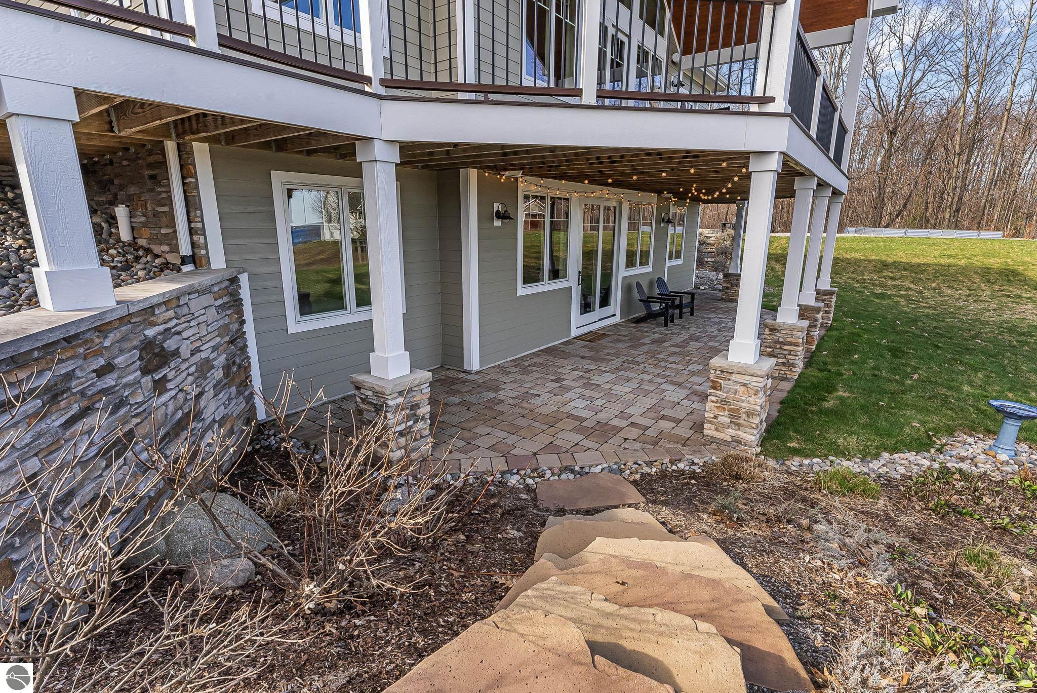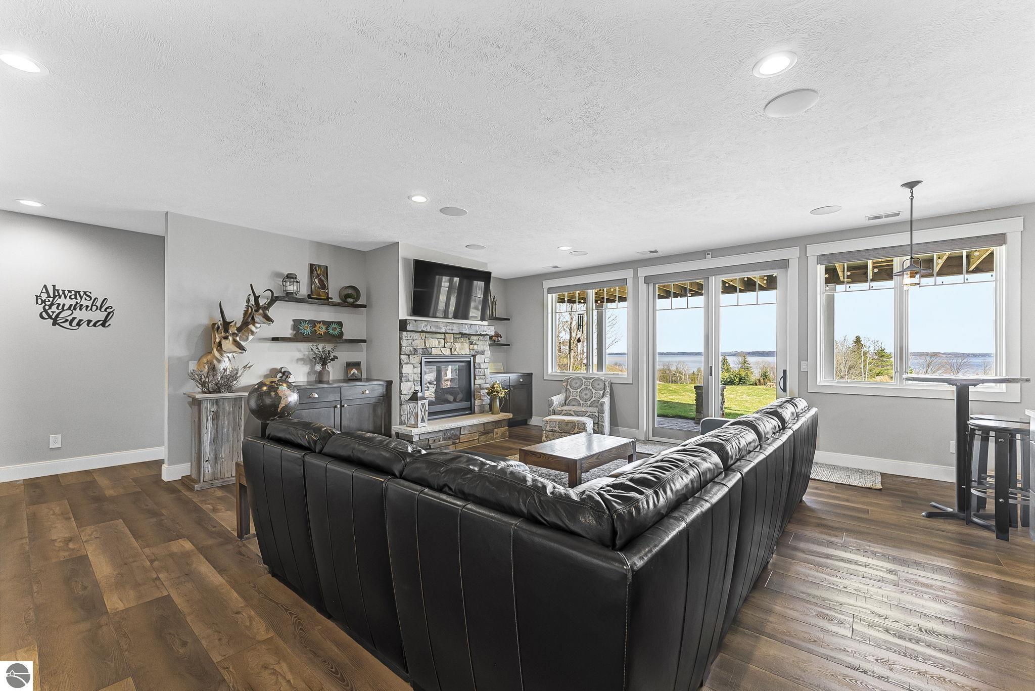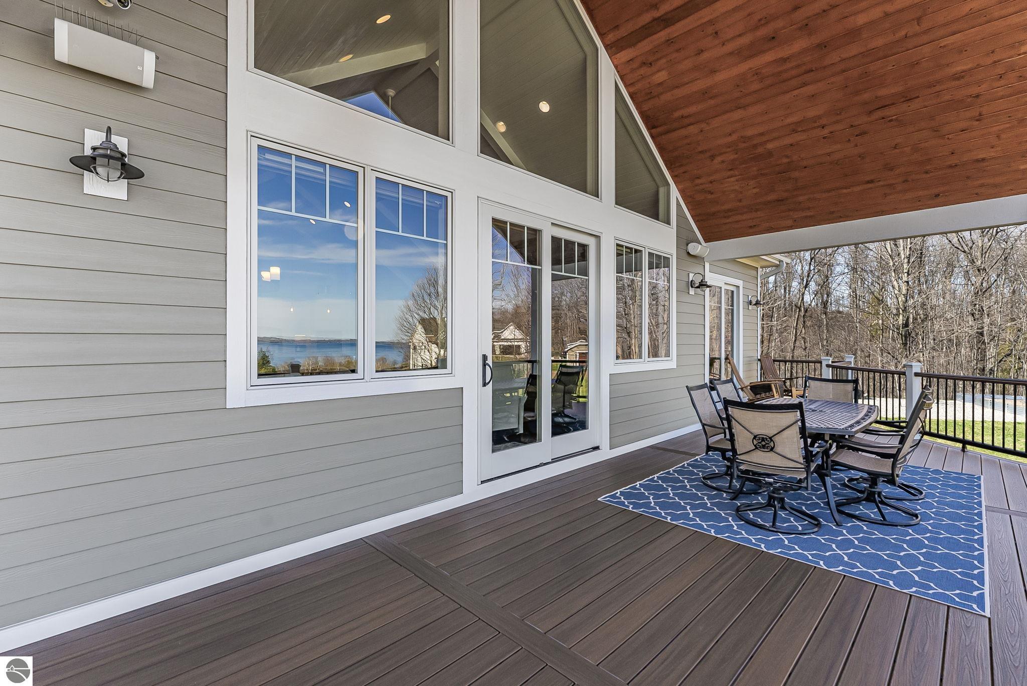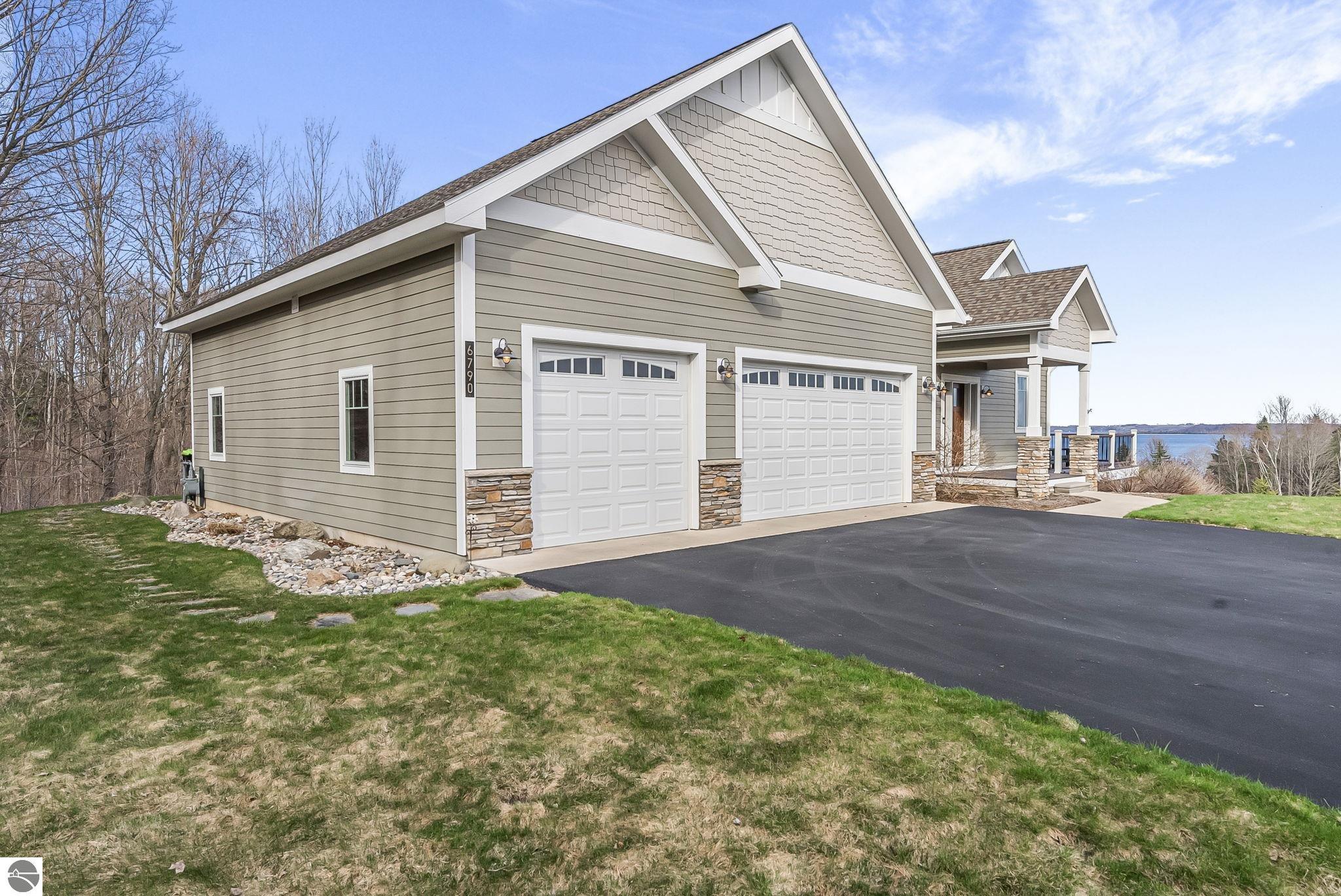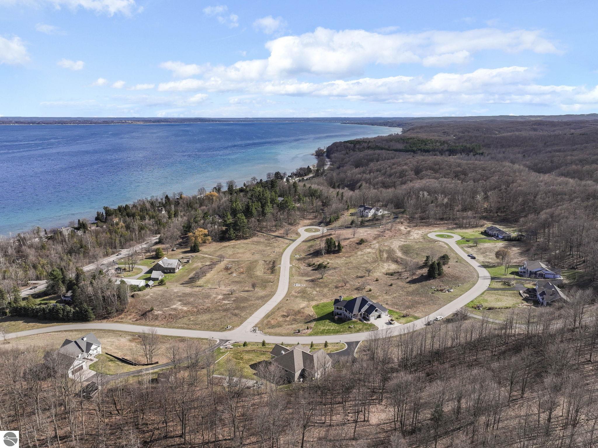 Breathtaking, unobstructed panoramic views of West Grand Traverse Bay and Power Island are showcased from the main living areas and all bedrooms in this custom Up North luxury home, ideally located just 10 minutes from Traverse City and Suttons Bay. Located in the sought-after Rolling Hills Estates subdivision, known for its collection of custom homes on spacious, well-appointed lots, the property offers convenient access to wineries, restaurants, breweries, and the Tart Trail. Situated on a 1.44-acre double parcel, the home features extensive professional landscaping representing a significant investment in thoughtfully designed outdoor living. Enjoy an immense wraparound Trex deck with privacy screen, a custom fire pit gathering area, and a beautiful paver patio off the walkout lower level, all positioned to take full advantage of the expansive bay views. The open-concept main level features vaulted shiplap ceilings with beams, expansive windows, hardwood flooring, and a chef’s kitchen with custom cabinetry, quartz countertops, and a walk-in pantry. Two gas fireplaces, located in the main living area and lower-level family room, provide warmth and ambiance. A fully integrated Control4 smart home system operates motorized blinds, lighting, sound, security system with cameras, thermostats, and garage doors. The walkout lower level includes a family room with surround sound, kitchenette, wine room, office, and three additional bedrooms, all designed to maximize comfort and flexibility. The home offers two en-suite bedrooms, including a main-level primary suite with a freestanding tub, walk-in shower, and heated floors, with heated floors also featured in the additional en-suite bath. The heated garage is fully finished with epoxy flooring, custom built-ins, and detailed trim work, plus hot and cold water. Additional features include Hardie Plank siding, Pella casement windows, dual-zone furnace, Generac, and a 12x14 custom shed. Measurements are estimated.