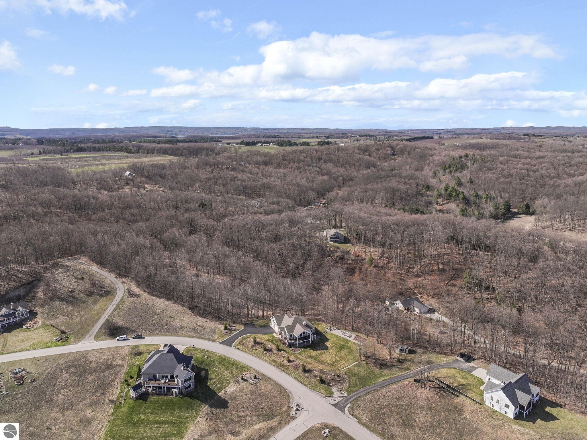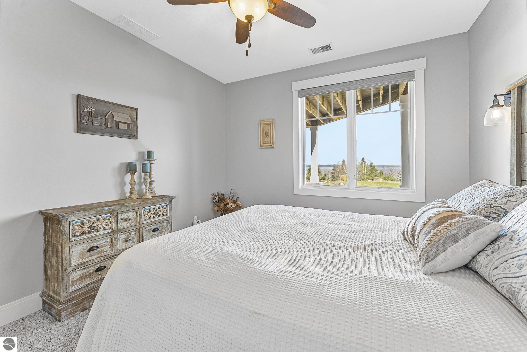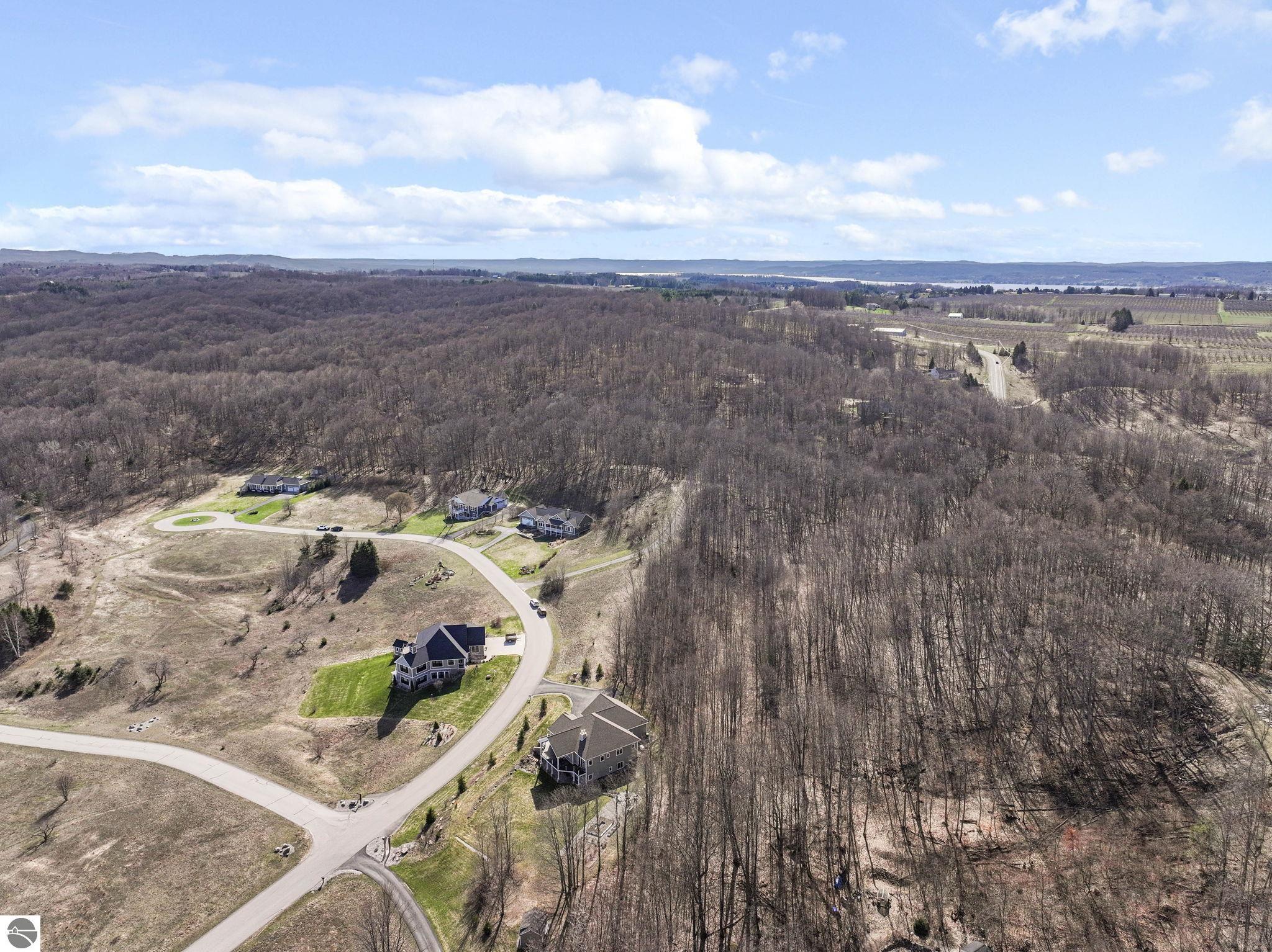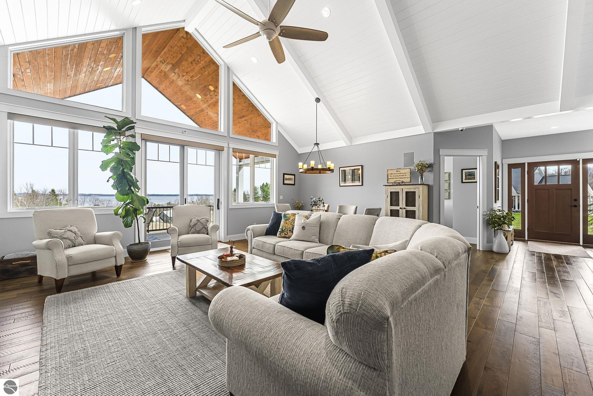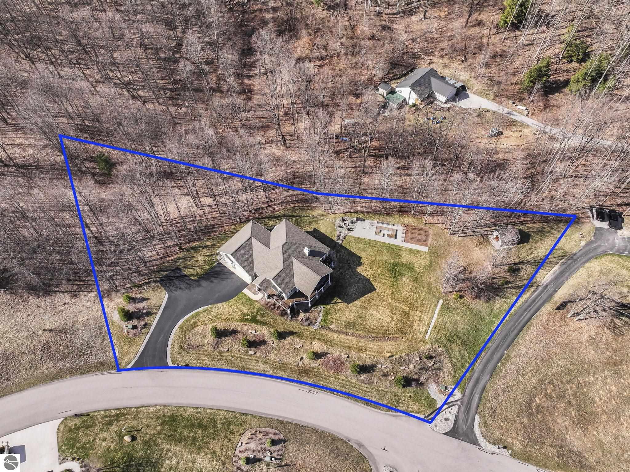 Breathtaking, unobstructed panoramic views of West Grand Traverse Bay and Power Island are showcased from the main living areas and all bedrooms in this custom Up North luxury home, ideally located just 10 minutes from Traverse City and Suttons Bay. Located in the sought-after Rolling Hills Estates subdivision, known for its collection of custom homes on spacious, well-appointed lots, the property offers convenient access to wineries, restaurants, breweries, and the Tart Trail. Situated on a 1.44-acre double parcel, the home features extensive professional landscaping representing a significant investment in thoughtfully designed outdoor living. Enjoy an immense wraparound Trex deck with privacy screen, a custom fire pit gathering area, and a beautiful paver patio off the walkout lower level, all positioned to take full advantage of the expansive bay views. The open-concept main level features vaulted shiplap ceilings with beams, expansive windows, hardwood flooring, and a chef’s kitchen with custom cabinetry, quartz countertops, and a walk-in pantry. Two gas fireplaces, located in the main living area and lower-level family room, provide warmth and ambiance. A fully integrated Control4 smart home system operates motorized blinds, lighting, sound, security system with cameras, thermostats, and garage doors. The walkout lower level includes a family room with surround sound, kitchenette, wine room, office, and three additional bedrooms, all designed to maximize comfort and flexibility. The home offers two en-suite bedrooms, including a main-level primary suite with a freestanding tub, walk-in shower, and heated floors, with heated floors also featured in the additional en-suite bath. The heated garage is fully finished with epoxy flooring, custom built-ins, and detailed trim work, plus hot and cold water. Additional features include Hardie Plank siding, Pella casement windows, dual-zone furnace, Generac, and a 12x14 custom shed. Measurements are estimated.