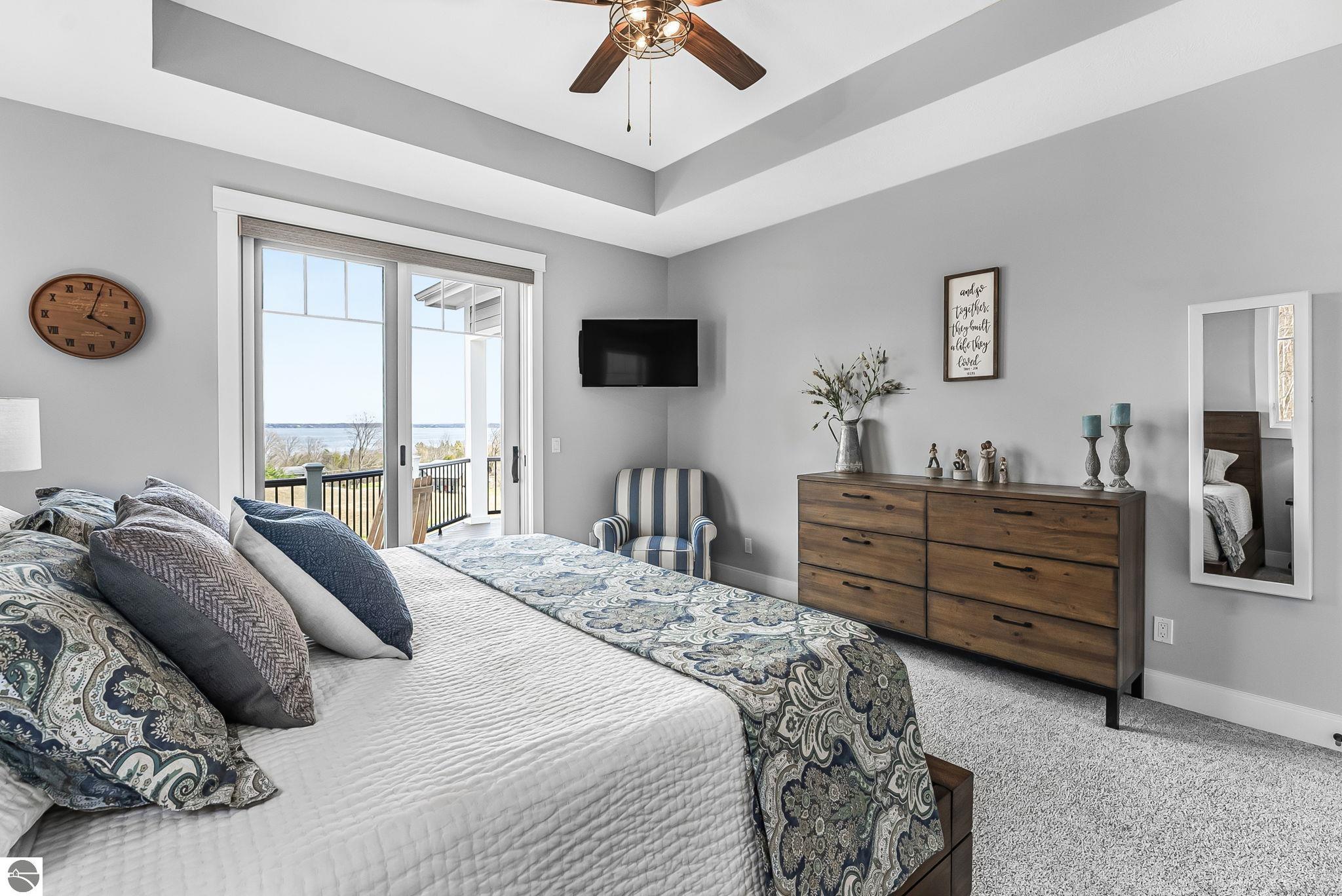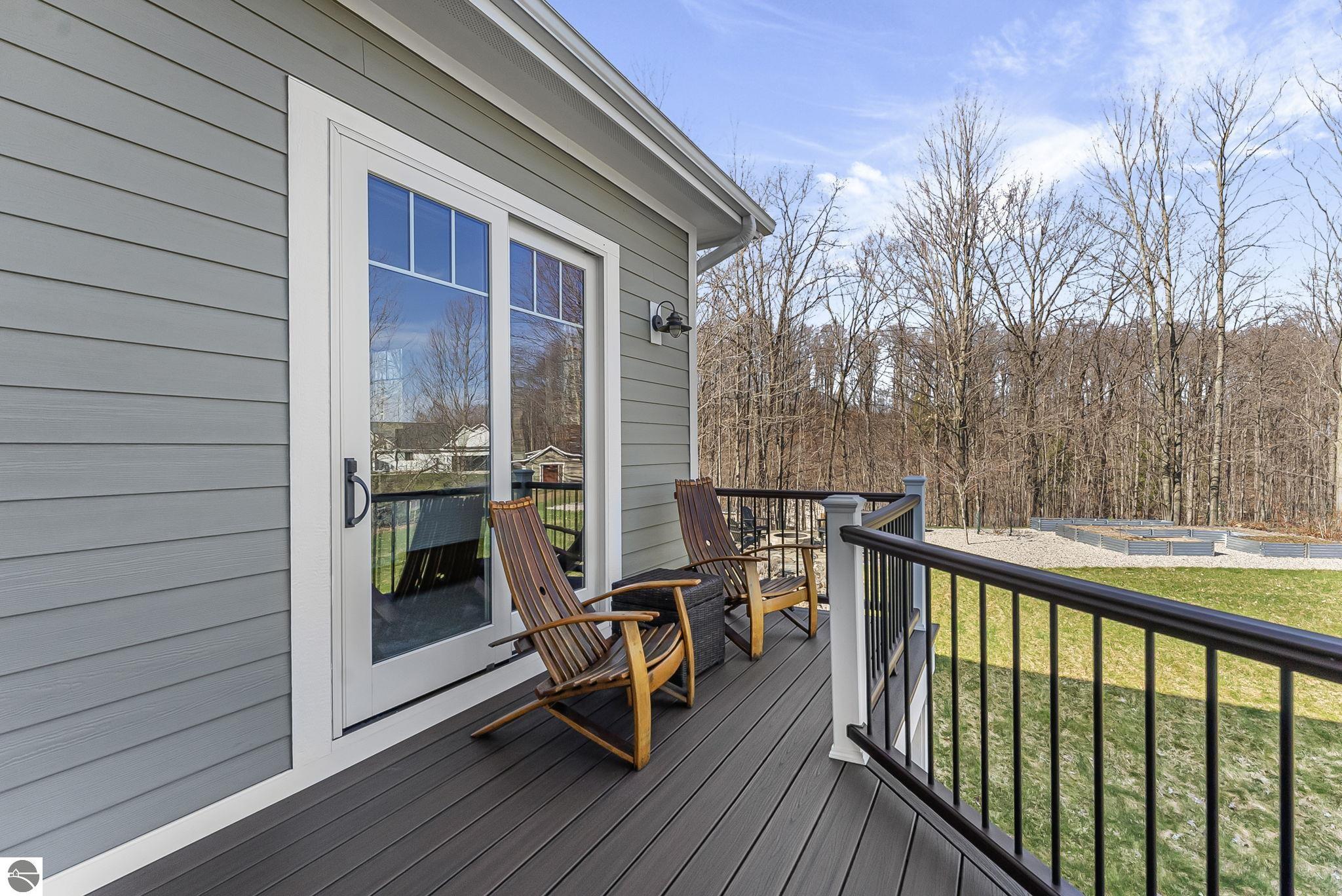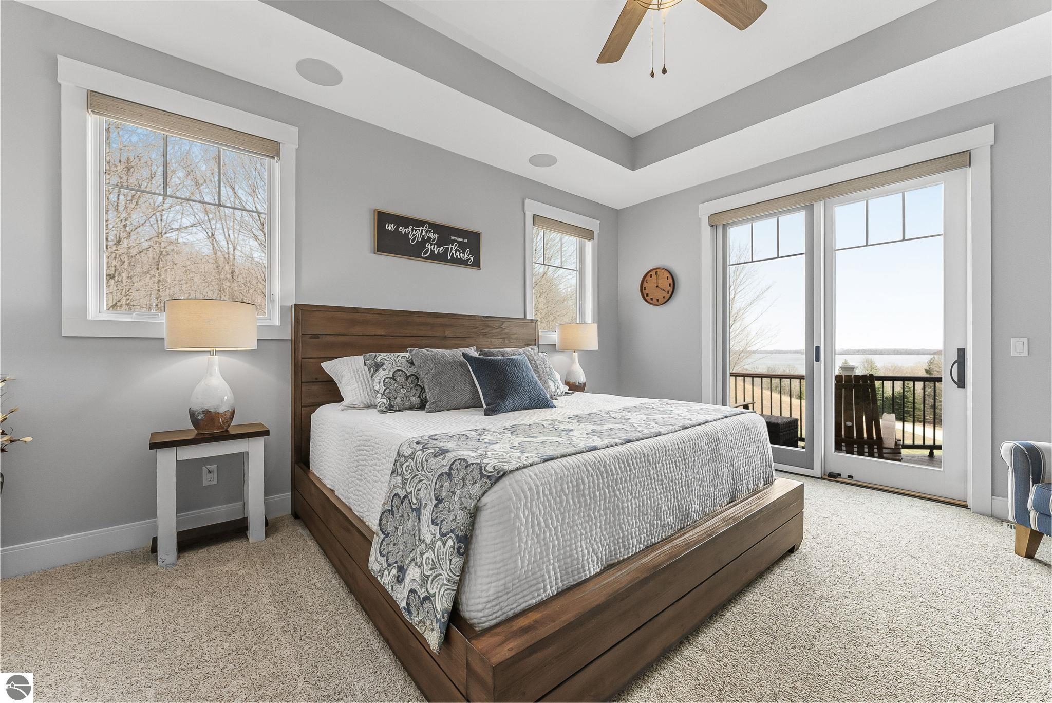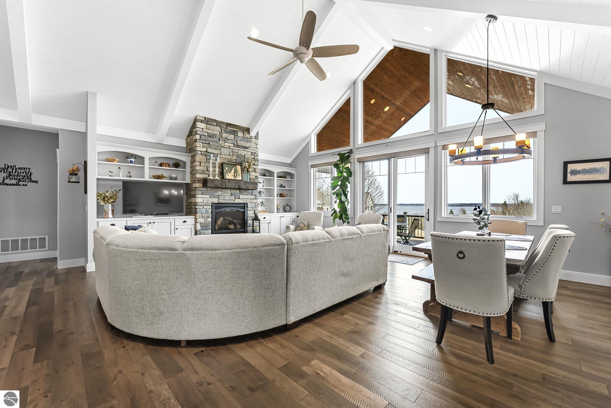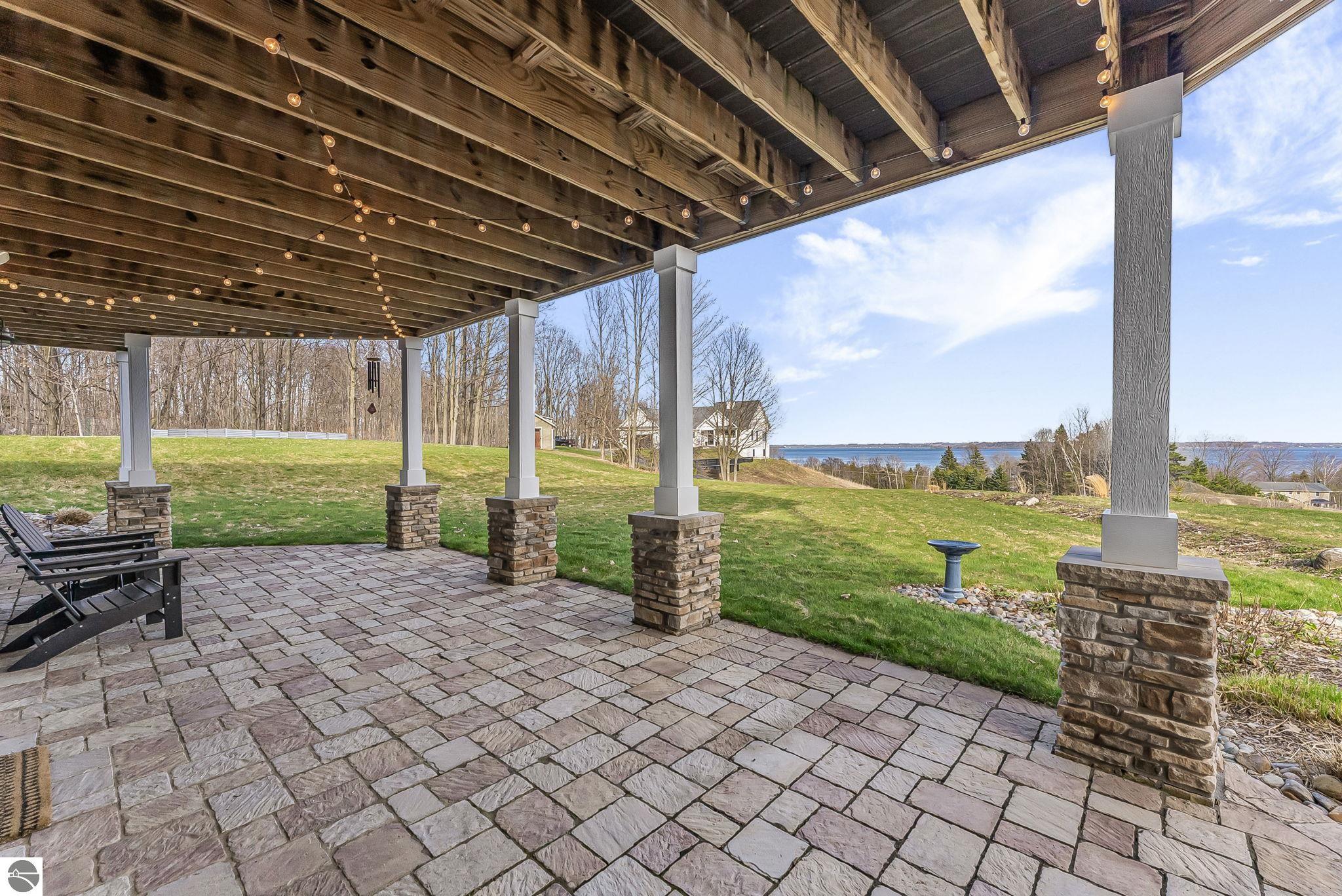 Breathtaking, unobstructed panoramic views of West Grand Traverse Bay and Power Island are showcased from the main living areas and all bedrooms in this custom Up North luxury home, ideally located just 10 minutes from Traverse City and Suttons Bay. Located in the sought-after Rolling Hills Estates subdivision, known for its collection of custom homes on spacious, well-appointed lots, the property offers convenient access to wineries, restaurants, breweries, and the Tart Trail. Situated on a 1.44-acre double parcel, the home features extensive professional landscaping representing a significant investment in thoughtfully designed outdoor living. Enjoy an immense wraparound Trex deck with privacy screen, a custom fire pit gathering area, and a beautiful paver patio off the walkout lower level, all positioned to take full advantage of the expansive bay views. The open-concept main level features vaulted shiplap ceilings with beams, expansive windows, hardwood flooring, and a chef’s kitchen with custom cabinetry, quartz countertops, and a walk-in pantry. Two gas fireplaces, located in the main living area and lower-level family room, provide warmth and ambiance. A fully integrated Control4 smart home system operates motorized blinds, lighting, sound, security system with cameras, thermostats, and garage doors. The walkout lower level includes a family room with surround sound, kitchenette, wine room, office, and three additional bedrooms, all designed to maximize comfort and flexibility. The home offers two en-suite bedrooms, including a main-level primary suite with a freestanding tub, walk-in shower, and heated floors, with heated floors also featured in the additional en-suite bath. The heated garage is fully finished with epoxy flooring, custom built-ins, and detailed trim work, plus hot and cold water. Additional features include Hardie Plank siding, Pella casement windows, dual-zone furnace, Generac, and a 12x14 custom shed. Measurements are estimated.