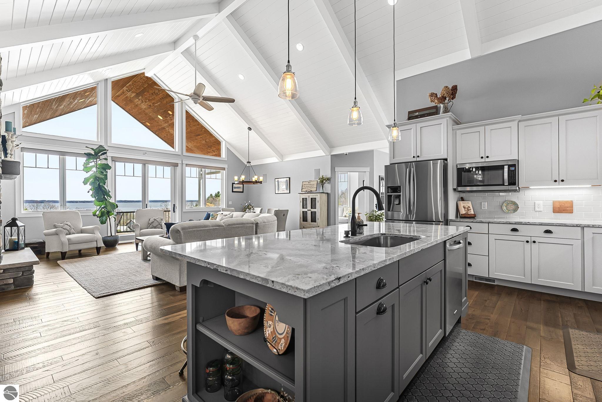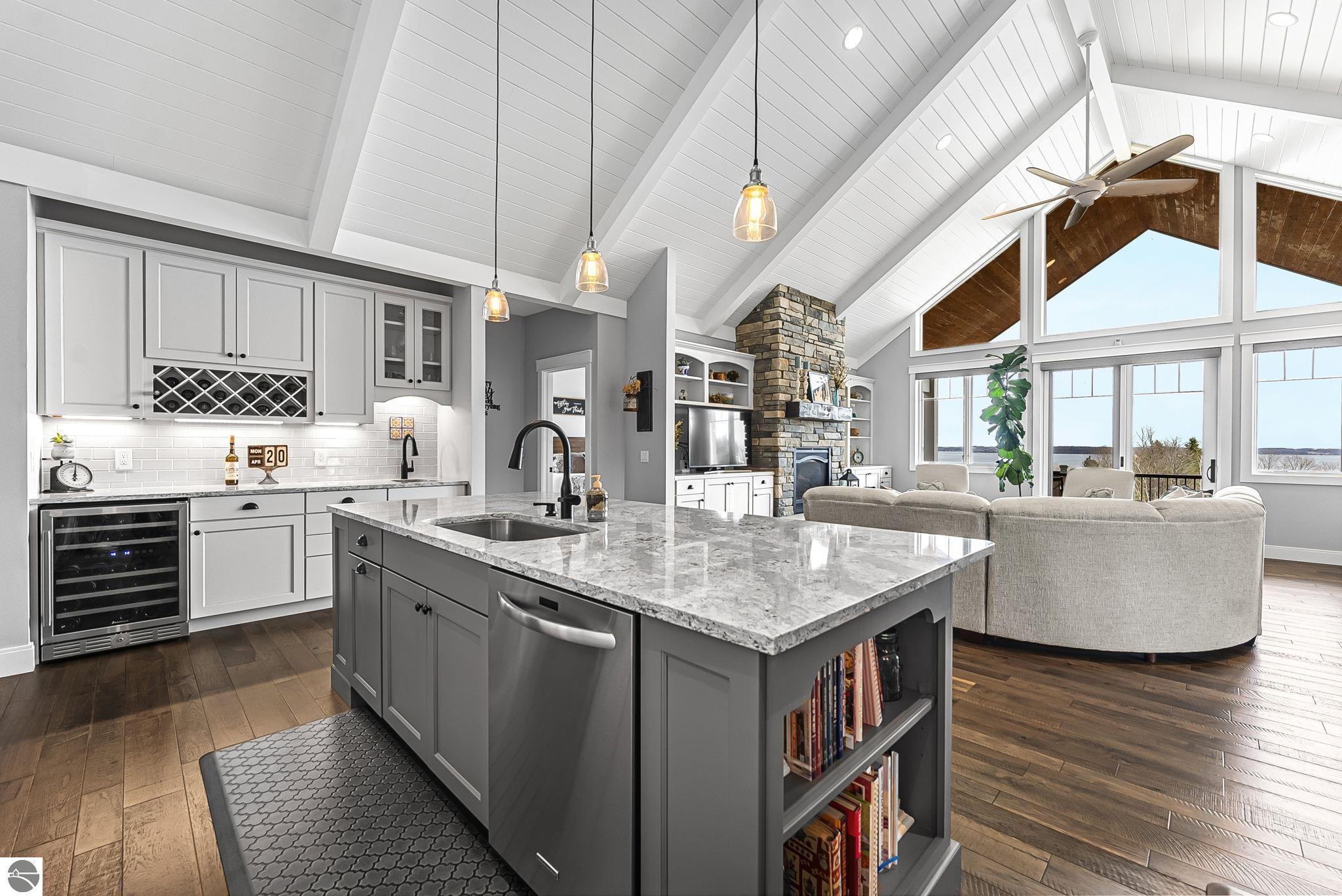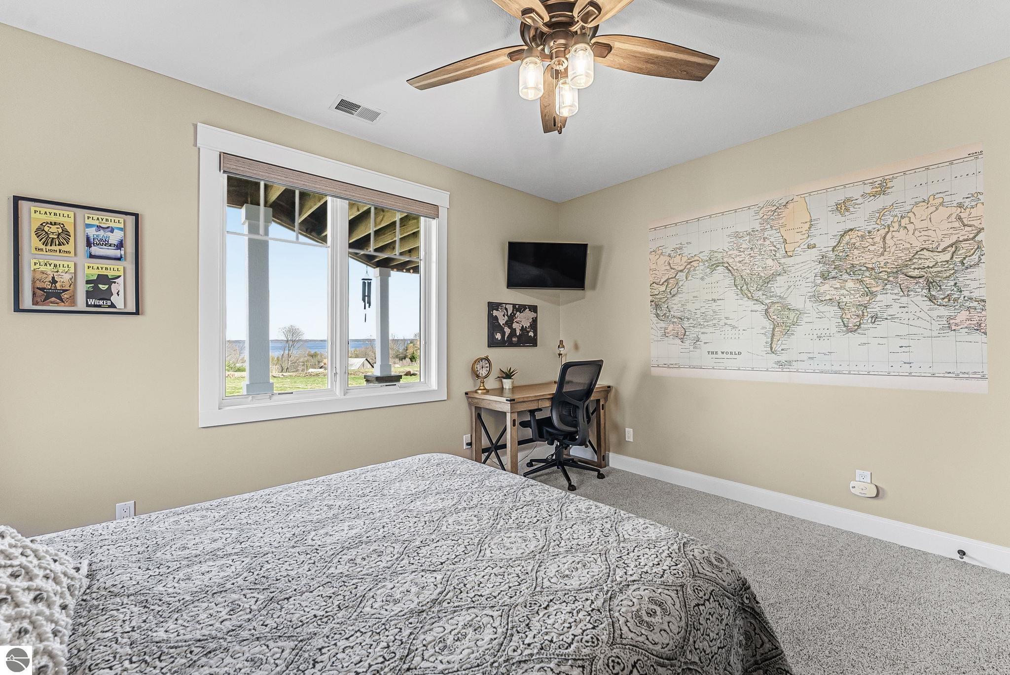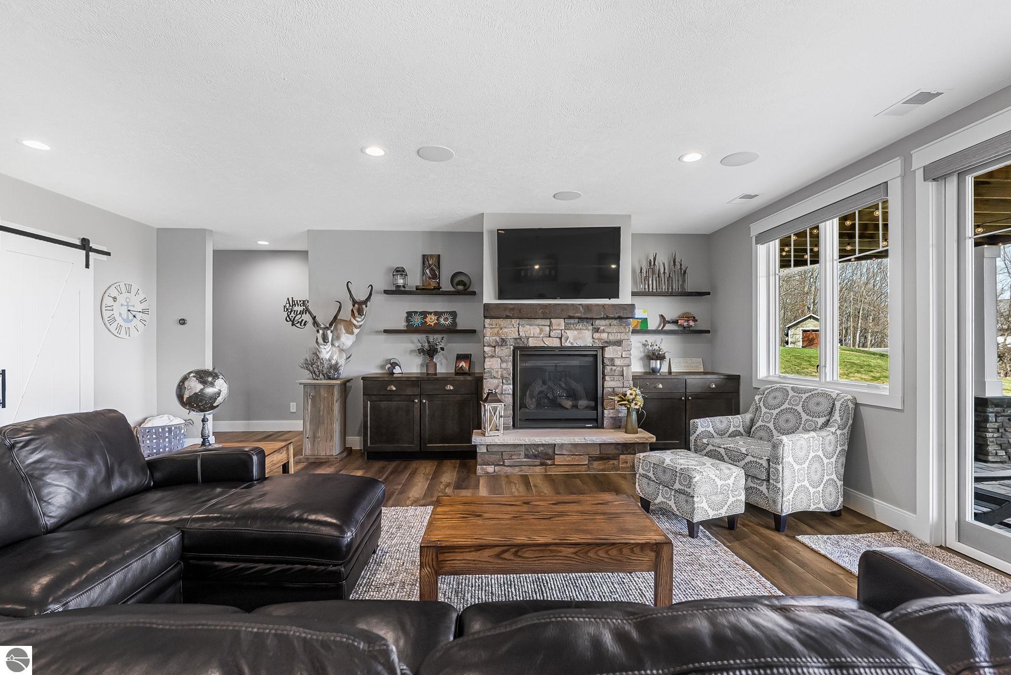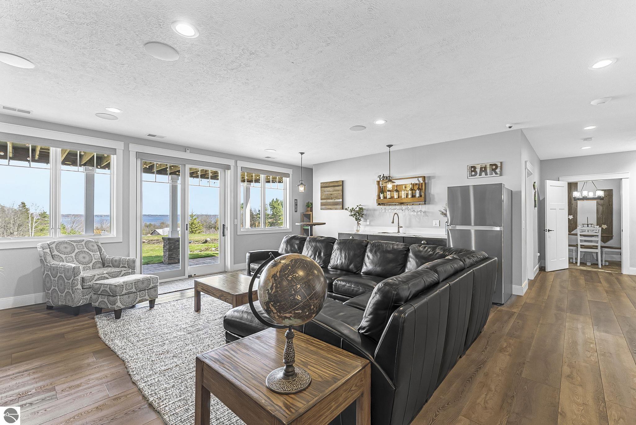 Breathtaking, unobstructed panoramic views of West Grand Traverse Bay and Power Island are showcased from the main living areas and all bedrooms in this custom Up North luxury home, ideally located just 10 minutes from Traverse City and Suttons Bay. Located in the sought-after Rolling Hills Estates subdivision, known for its collection of custom homes on spacious, well-appointed lots, the property offers convenient access to wineries, restaurants, breweries, and the Tart Trail. Situated on a 1.44-acre double parcel, the home features extensive professional landscaping representing a significant investment in thoughtfully designed outdoor living. Enjoy an immense wraparound Trex deck with privacy screen, a custom fire pit gathering area, and a beautiful paver patio off the walkout lower level, all positioned to take full advantage of the expansive bay views. The open-concept main level features vaulted shiplap ceilings with beams, expansive windows, hardwood flooring, and a chef’s kitchen with custom cabinetry, quartz countertops, and a walk-in pantry. Two gas fireplaces, located in the main living area and lower-level family room, provide warmth and ambiance. A fully integrated Control4 smart home system operates motorized blinds, lighting, sound, security system with cameras, thermostats, and garage doors. The walkout lower level includes a family room with surround sound, kitchenette, wine room, office, and three additional bedrooms, all designed to maximize comfort and flexibility. The home offers two en-suite bedrooms, including a main-level primary suite with a freestanding tub, walk-in shower, and heated floors, with heated floors also featured in the additional en-suite bath. The heated garage is fully finished with epoxy flooring, custom built-ins, and detailed trim work, plus hot and cold water. Additional features include Hardie Plank siding, Pella casement windows, dual-zone furnace, Generac, and a 12x14 custom shed. Measurements are estimated.