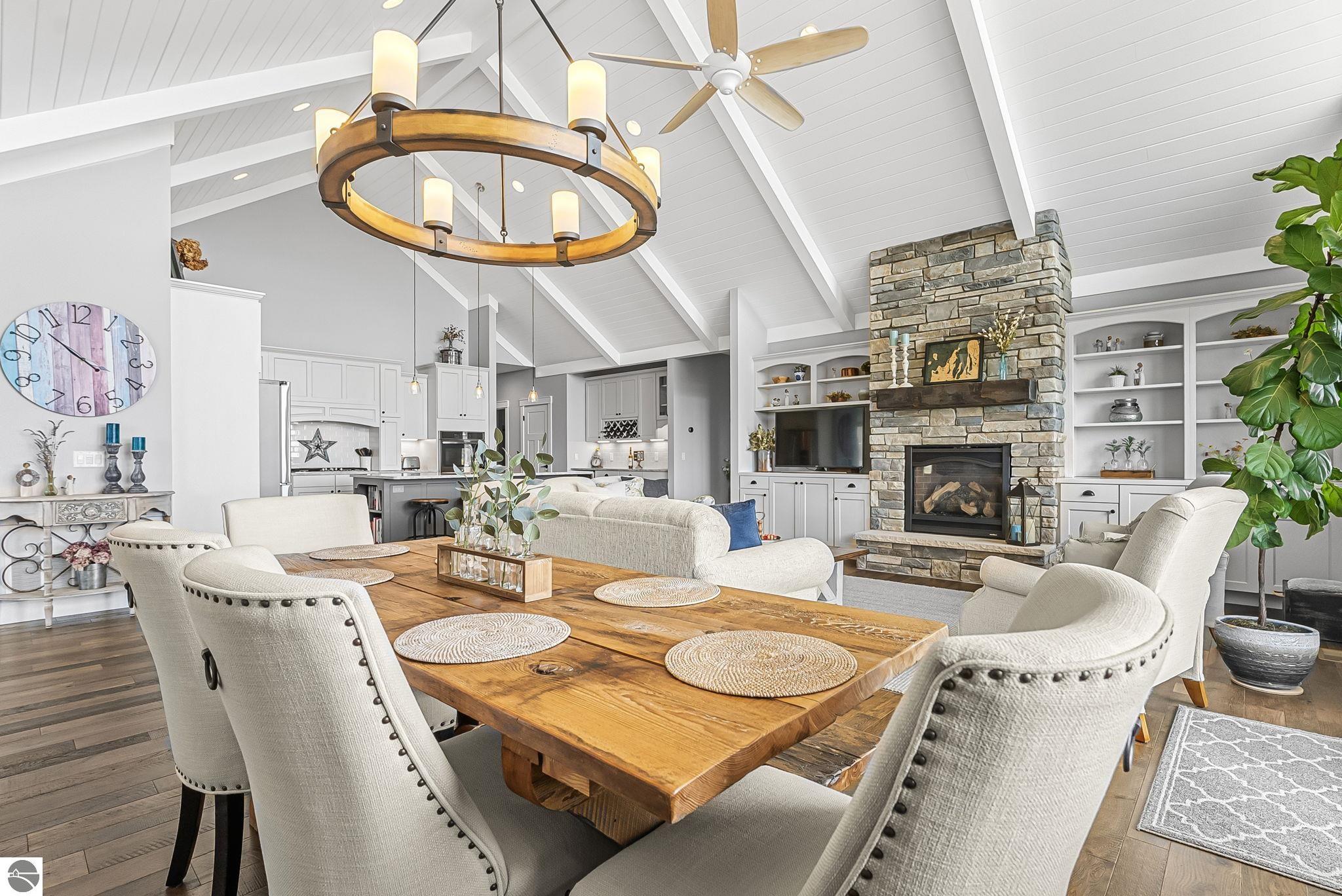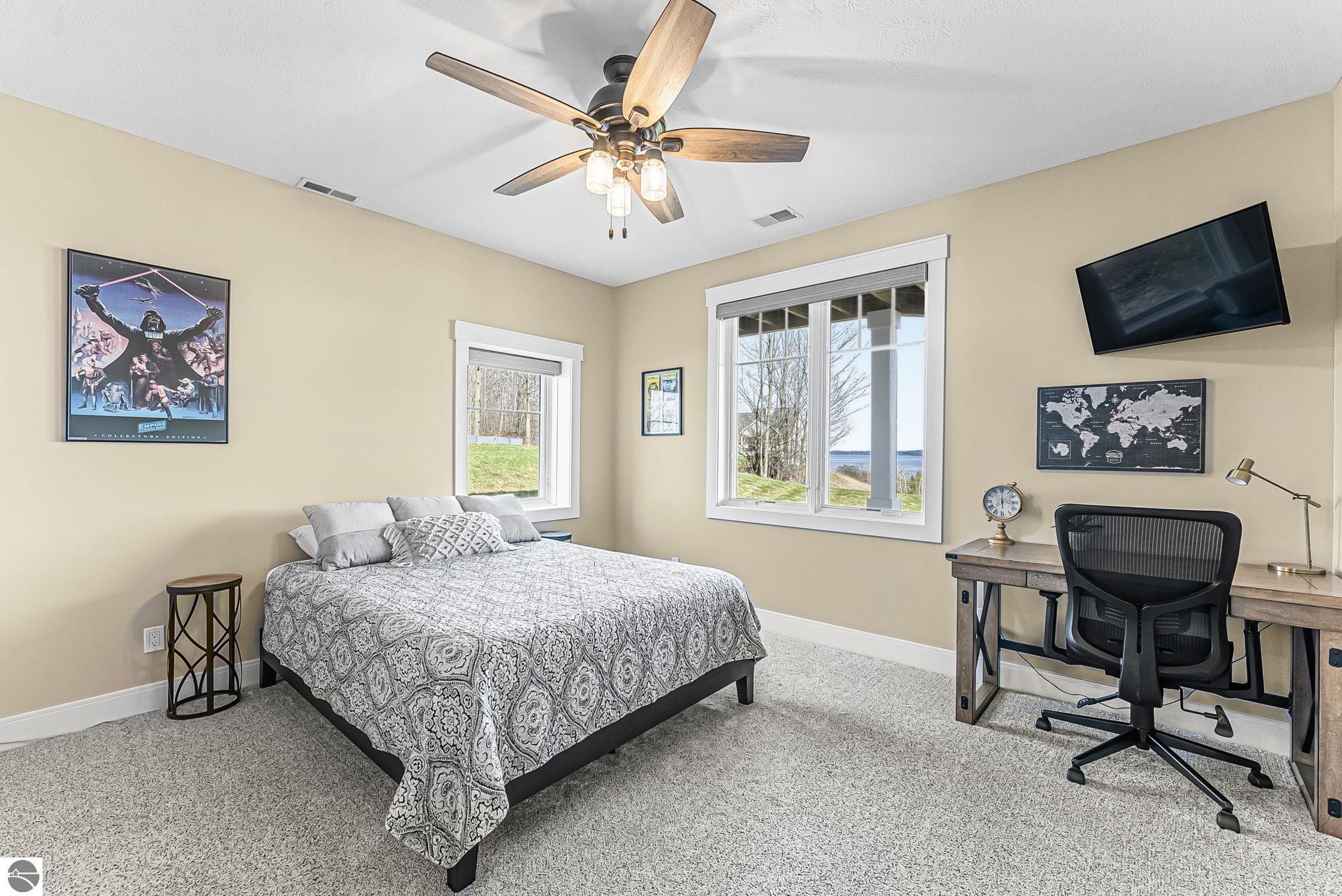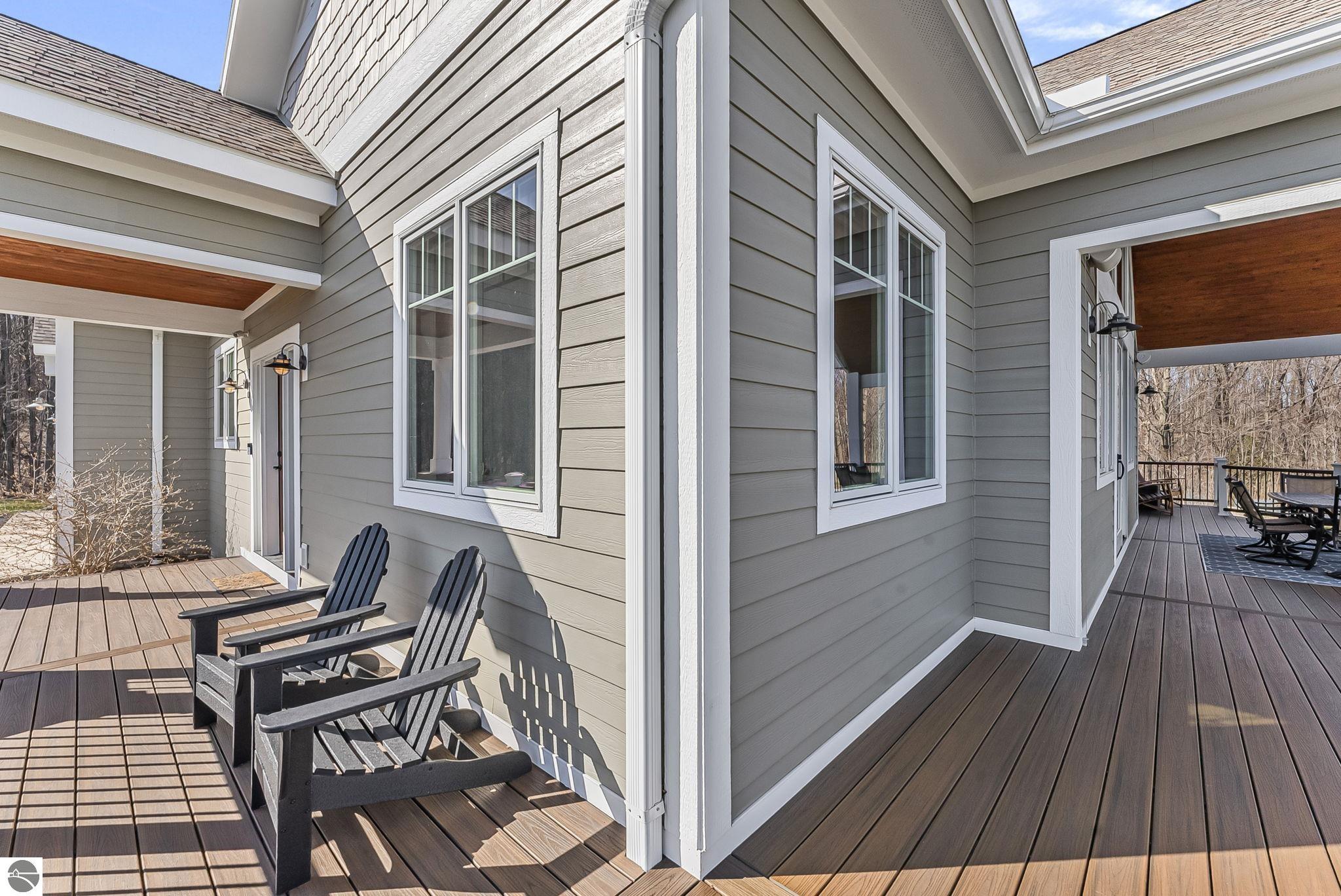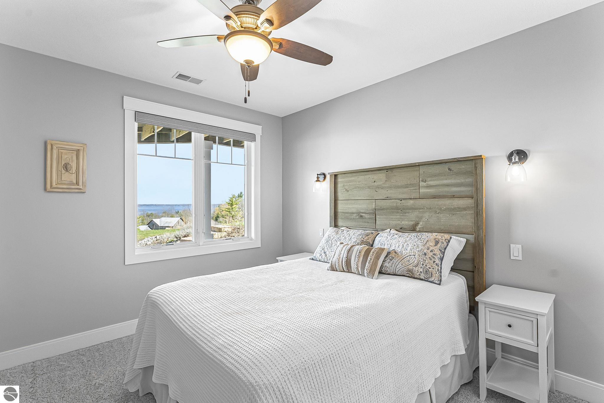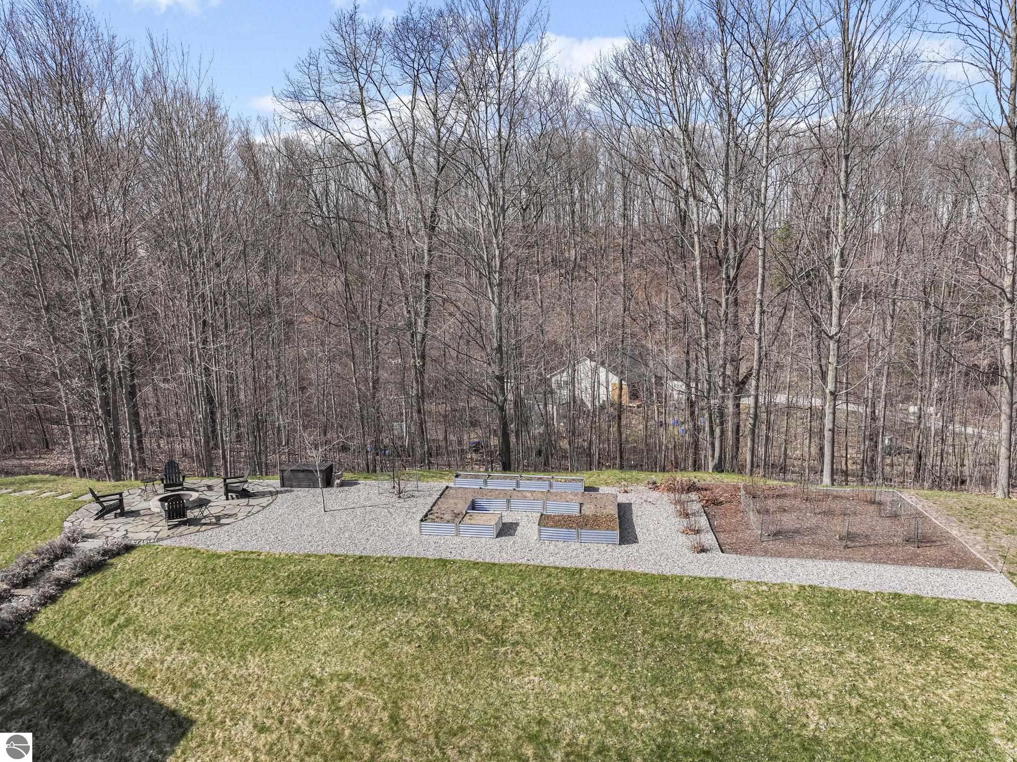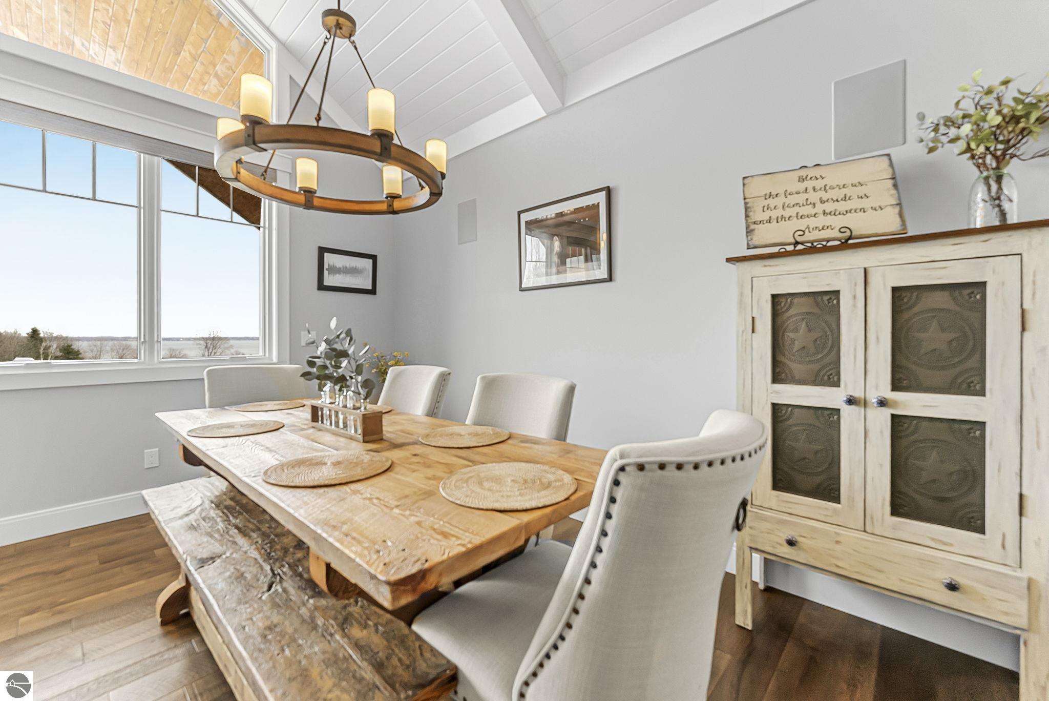 Breathtaking, unobstructed panoramic views of West Grand Traverse Bay and Power Island are showcased from the main living areas and all bedrooms in this custom Up North luxury home, ideally located just 10 minutes from Traverse City and Suttons Bay. Located in the sought-after Rolling Hills Estates subdivision, known for its collection of custom homes on spacious, well-appointed lots, the property offers convenient access to wineries, restaurants, breweries, and the Tart Trail. Situated on a 1.44-acre double parcel, the home features extensive professional landscaping representing a significant investment in thoughtfully designed outdoor living. Enjoy an immense wraparound Trex deck with privacy screen, a custom fire pit gathering area, and a beautiful paver patio off the walkout lower level, all positioned to take full advantage of the expansive bay views. The open-concept main level features vaulted shiplap ceilings with beams, expansive windows, hardwood flooring, and a chef’s kitchen with custom cabinetry, quartz countertops, and a walk-in pantry. Two gas fireplaces, located in the main living area and lower-level family room, provide warmth and ambiance. A fully integrated Control4 smart home system operates motorized blinds, lighting, sound, security system with cameras, thermostats, and garage doors. The walkout lower level includes a family room with surround sound, kitchenette, wine room, office, and three additional bedrooms, all designed to maximize comfort and flexibility. The home offers two en-suite bedrooms, including a main-level primary suite with a freestanding tub, walk-in shower, and heated floors, with heated floors also featured in the additional en-suite bath. The heated garage is fully finished with epoxy flooring, custom built-ins, and detailed trim work, plus hot and cold water. Additional features include Hardie Plank siding, Pella casement windows, dual-zone furnace, Generac, and a 12x14 custom shed. Measurements are estimated.