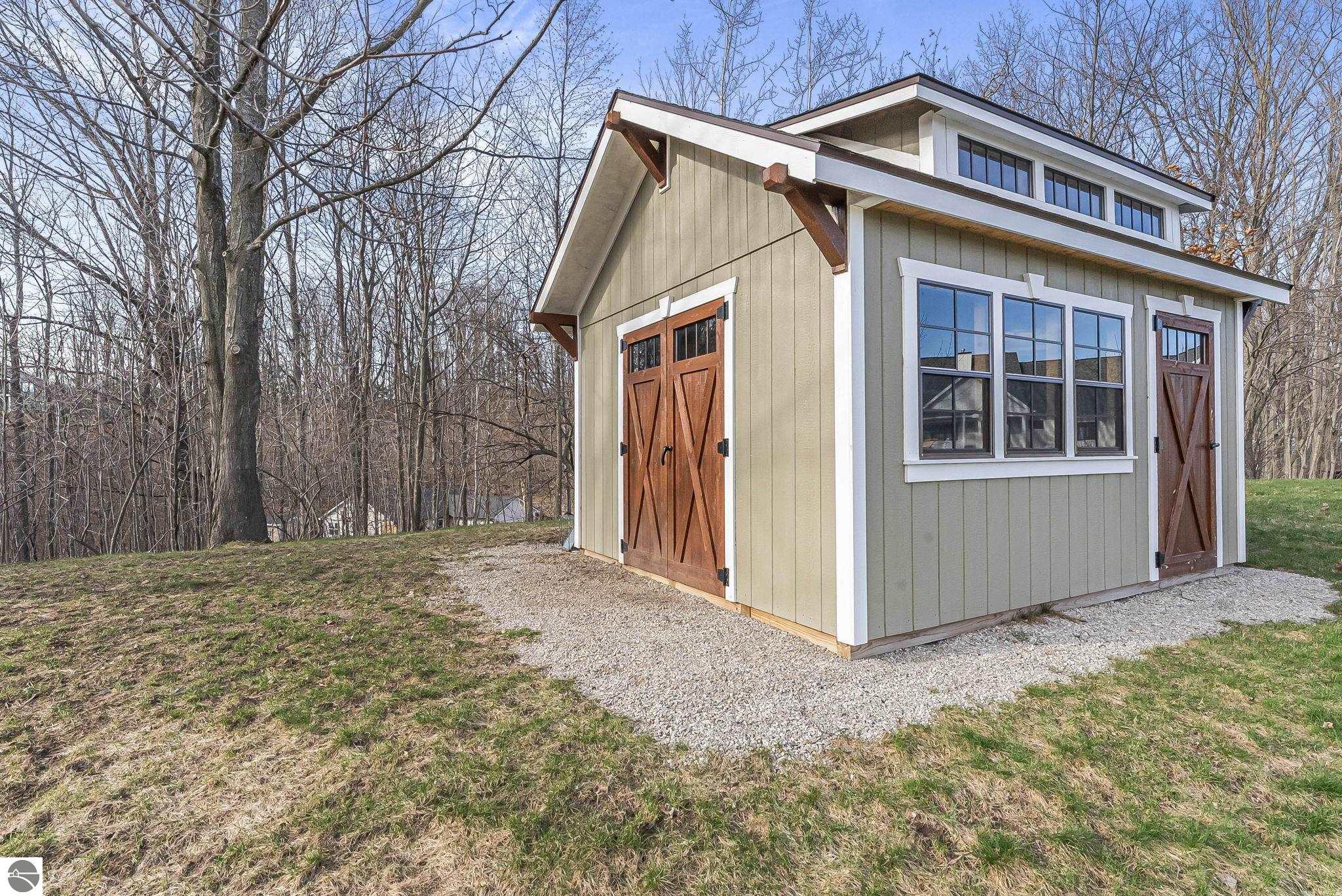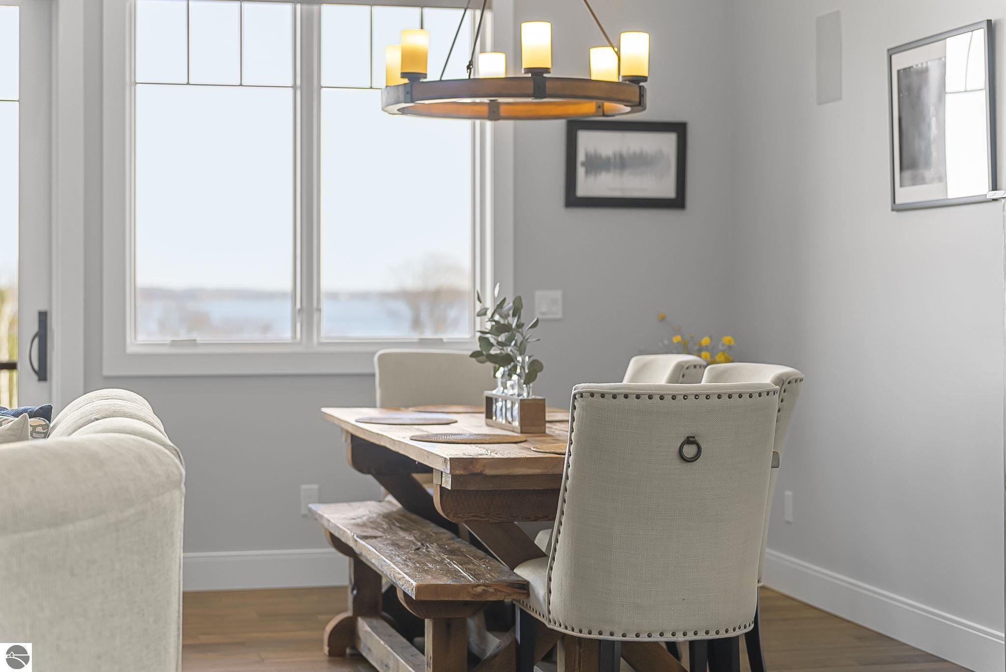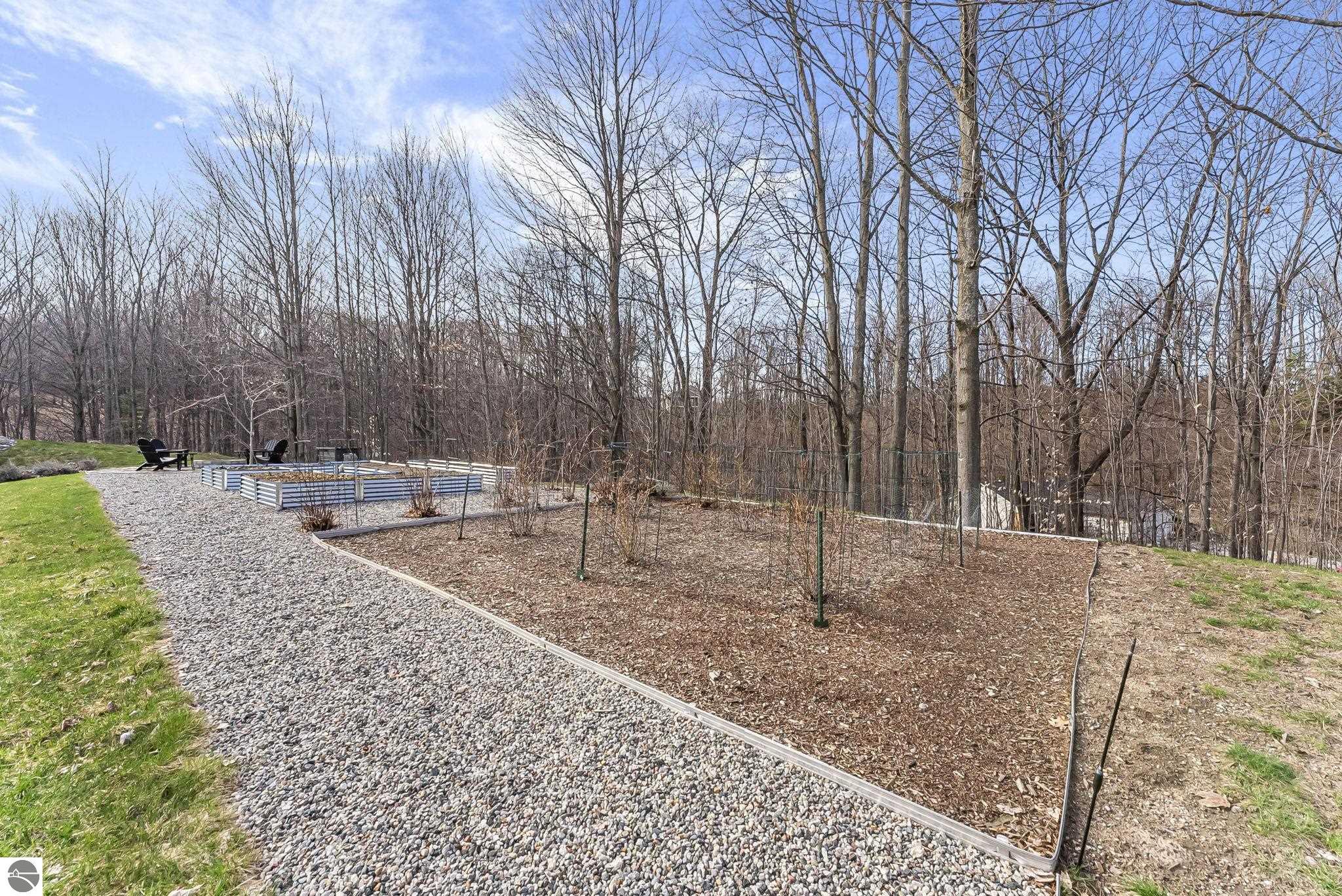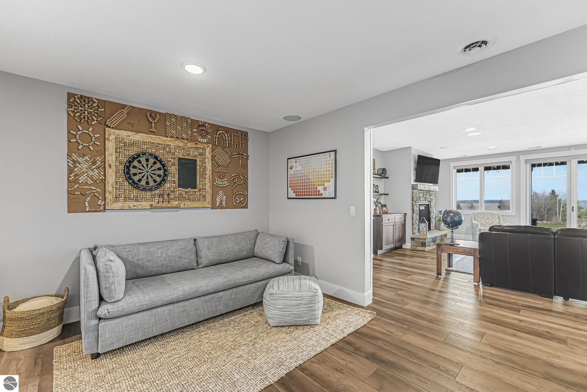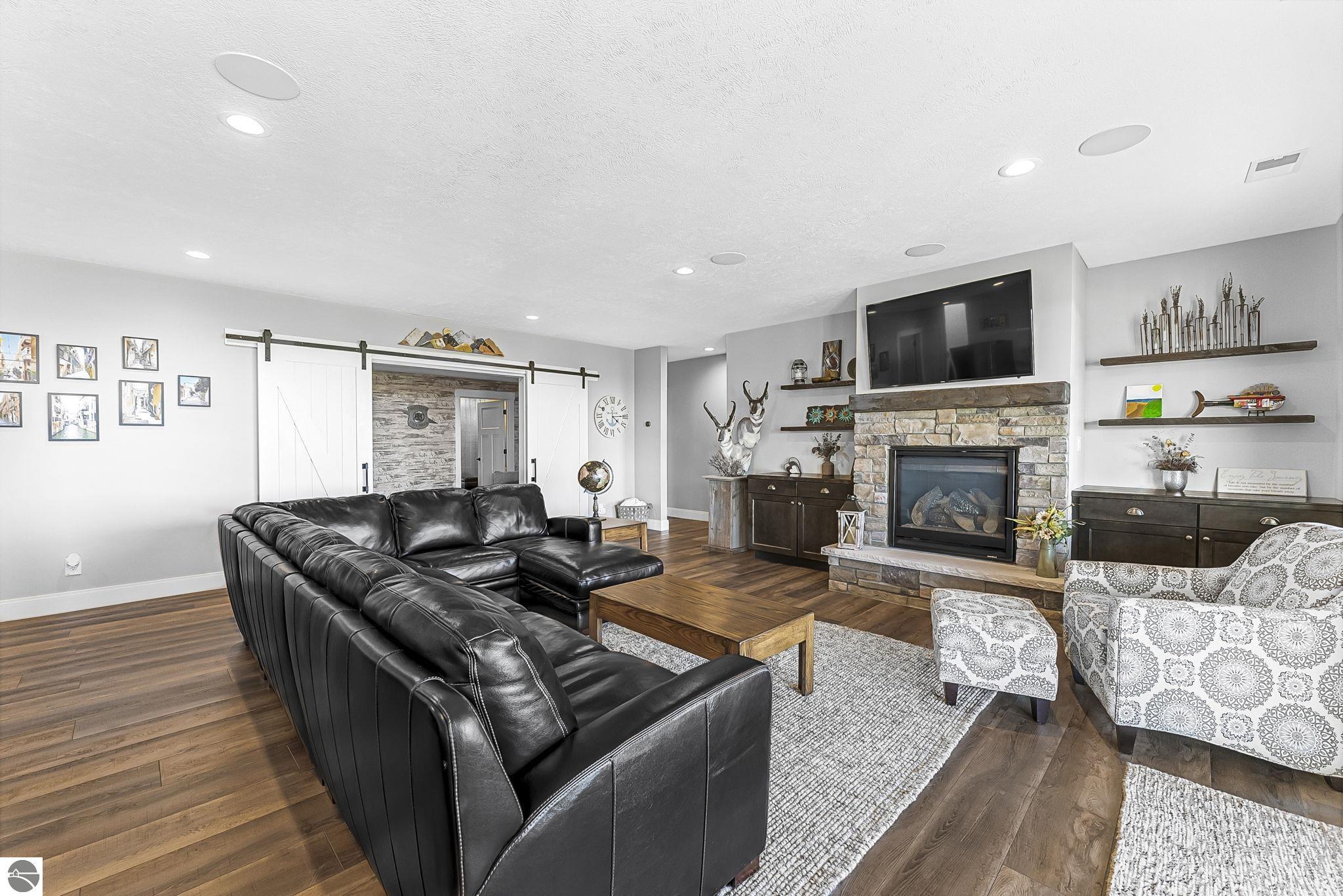 Breathtaking, unobstructed panoramic views of West Grand Traverse Bay and Power Island are showcased from the main living areas and all bedrooms in this custom Up North luxury home, ideally located just 10 minutes from Traverse City and Suttons Bay. Located in the sought-after Rolling Hills Estates subdivision, known for its collection of custom homes on spacious, well-appointed lots, the property offers convenient access to wineries, restaurants, breweries, and the Tart Trail. Situated on a 1.44-acre double parcel, the home features extensive professional landscaping representing a significant investment in thoughtfully designed outdoor living. Enjoy an immense wraparound Trex deck with privacy screen, a custom fire pit gathering area, and a beautiful paver patio off the walkout lower level, all positioned to take full advantage of the expansive bay views. The open-concept main level features vaulted shiplap ceilings with beams, expansive windows, hardwood flooring, and a chef’s kitchen with custom cabinetry, quartz countertops, and a walk-in pantry. Two gas fireplaces, located in the main living area and lower-level family room, provide warmth and ambiance. A fully integrated Control4 smart home system operates motorized blinds, lighting, sound, security system with cameras, thermostats, and garage doors. The walkout lower level includes a family room with surround sound, kitchenette, wine room, office, and three additional bedrooms, all designed to maximize comfort and flexibility. The home offers two en-suite bedrooms, including a main-level primary suite with a freestanding tub, walk-in shower, and heated floors, with heated floors also featured in the additional en-suite bath. The heated garage is fully finished with epoxy flooring, custom built-ins, and detailed trim work, plus hot and cold water. Additional features include Hardie Plank siding, Pella casement windows, dual-zone furnace, Generac, and a 12x14 custom shed. Measurements are estimated.