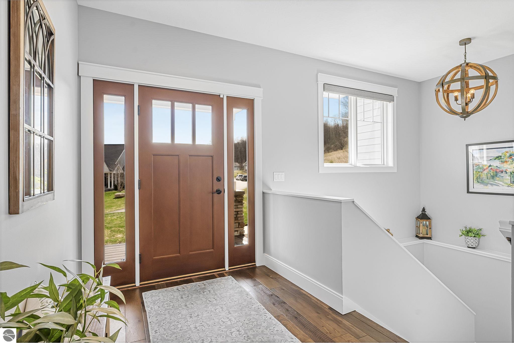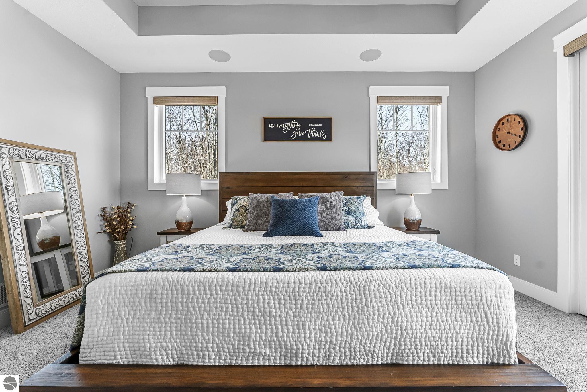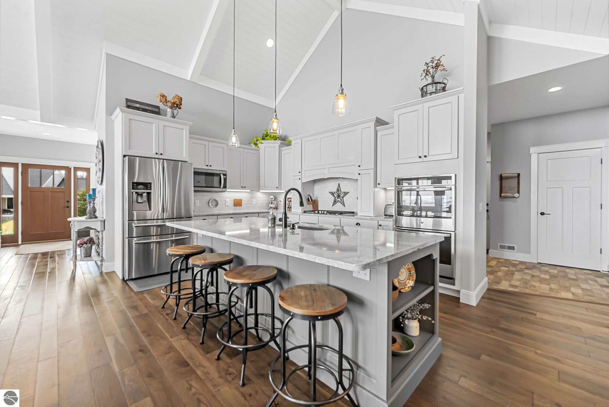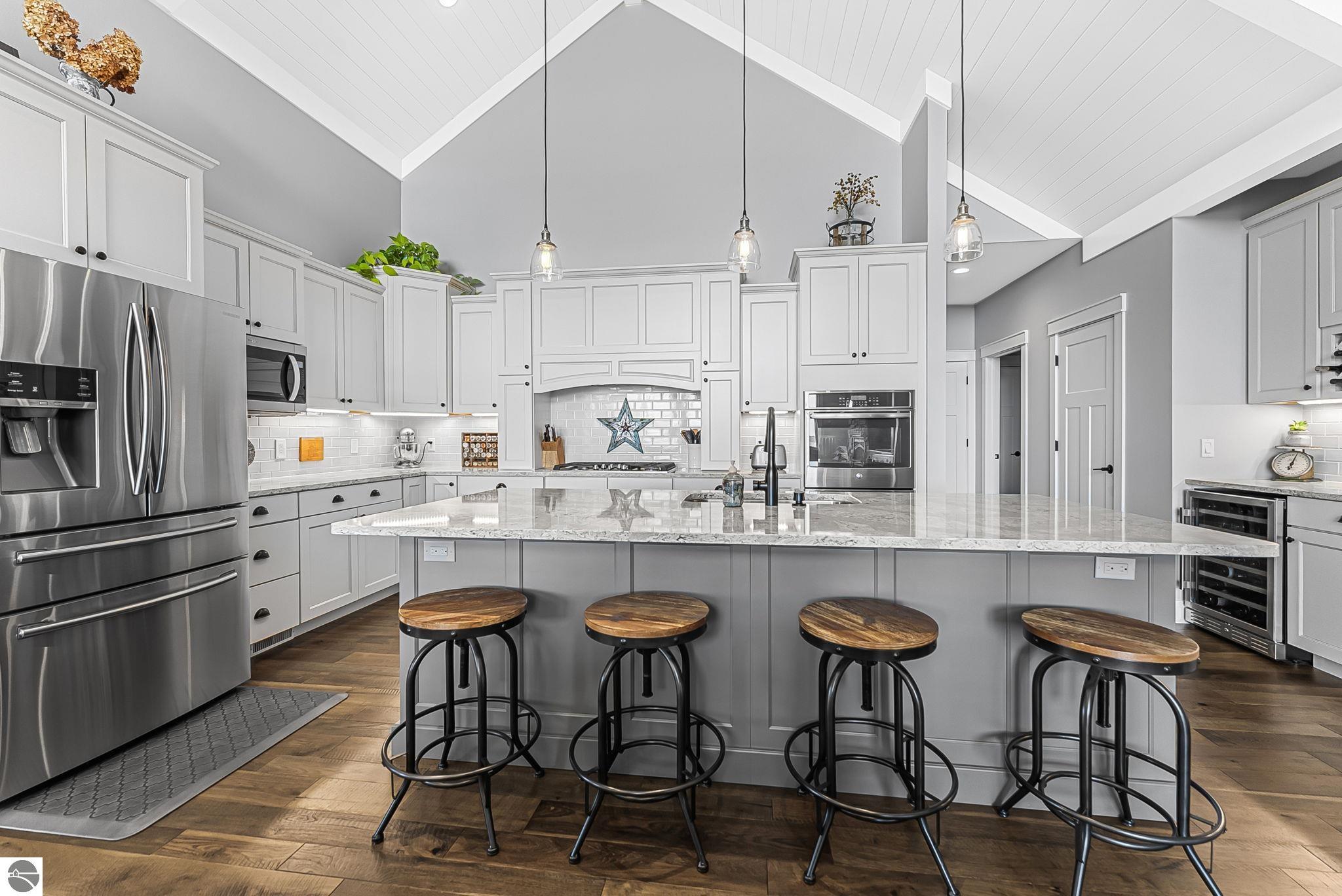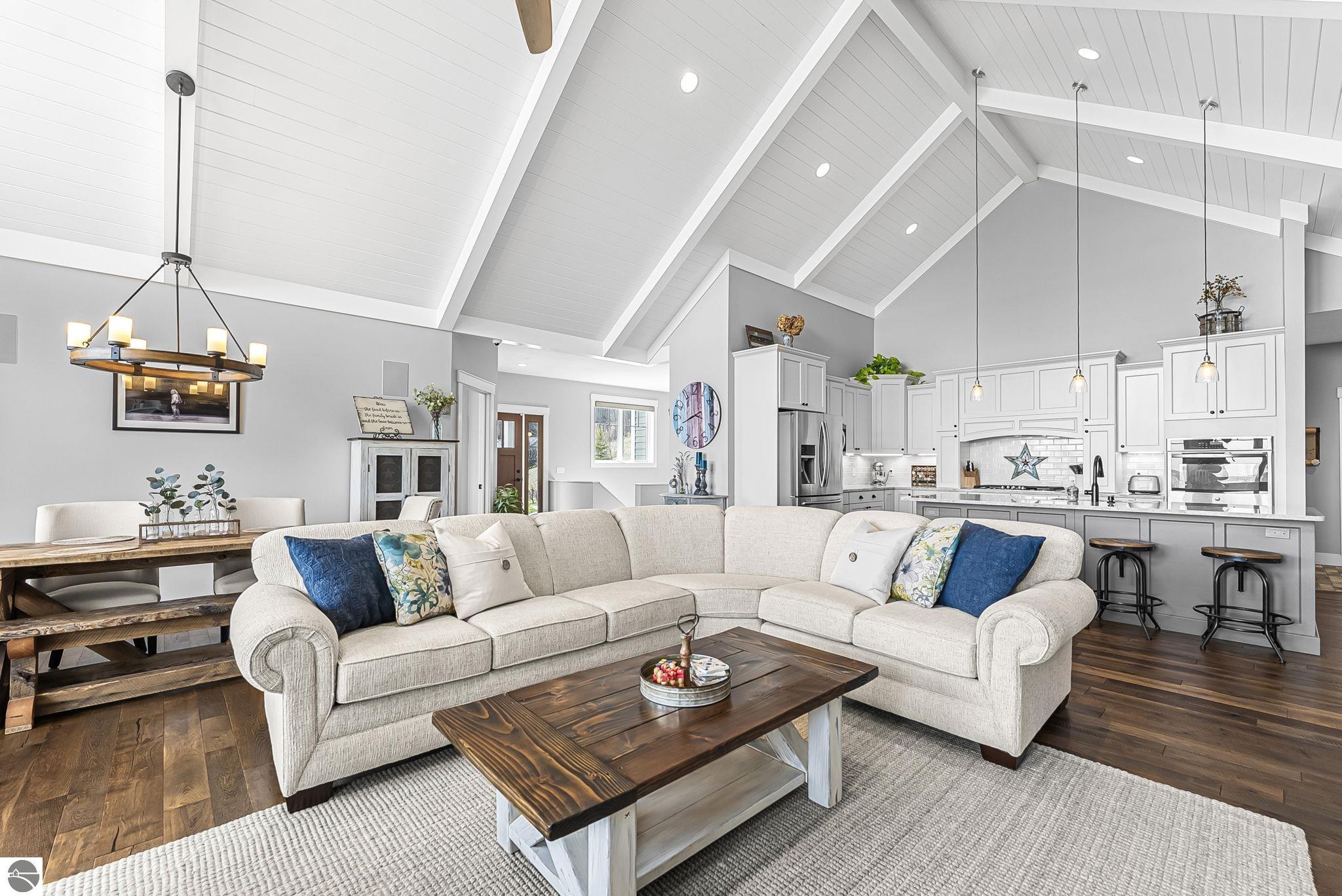 Breathtaking, unobstructed panoramic views of West Grand Traverse Bay and Power Island are showcased from the main living areas and all bedrooms in this custom Up North luxury home, ideally located just 10 minutes from Traverse City and Suttons Bay. Located in the sought-after Rolling Hills Estates subdivision, known for its collection of custom homes on spacious, well-appointed lots, the property offers convenient access to wineries, restaurants, breweries, and the Tart Trail. Situated on a 1.44-acre double parcel, the home features extensive professional landscaping representing a significant investment in thoughtfully designed outdoor living. Enjoy an immense wraparound Trex deck with privacy screen, a custom fire pit gathering area, and a beautiful paver patio off the walkout lower level, all positioned to take full advantage of the expansive bay views. The open-concept main level features vaulted shiplap ceilings with beams, expansive windows, hardwood flooring, and a chef’s kitchen with custom cabinetry, quartz countertops, and a walk-in pantry. Two gas fireplaces, located in the main living area and lower-level family room, provide warmth and ambiance. A fully integrated Control4 smart home system operates motorized blinds, lighting, sound, security system with cameras, thermostats, and garage doors. The walkout lower level includes a family room with surround sound, kitchenette, wine room, office, and three additional bedrooms, all designed to maximize comfort and flexibility. The home offers two en-suite bedrooms, including a main-level primary suite with a freestanding tub, walk-in shower, and heated floors, with heated floors also featured in the additional en-suite bath. The heated garage is fully finished with epoxy flooring, custom built-ins, and detailed trim work, plus hot and cold water. Additional features include Hardie Plank siding, Pella casement windows, dual-zone furnace, Generac, and a 12x14 custom shed. Measurements are estimated.
