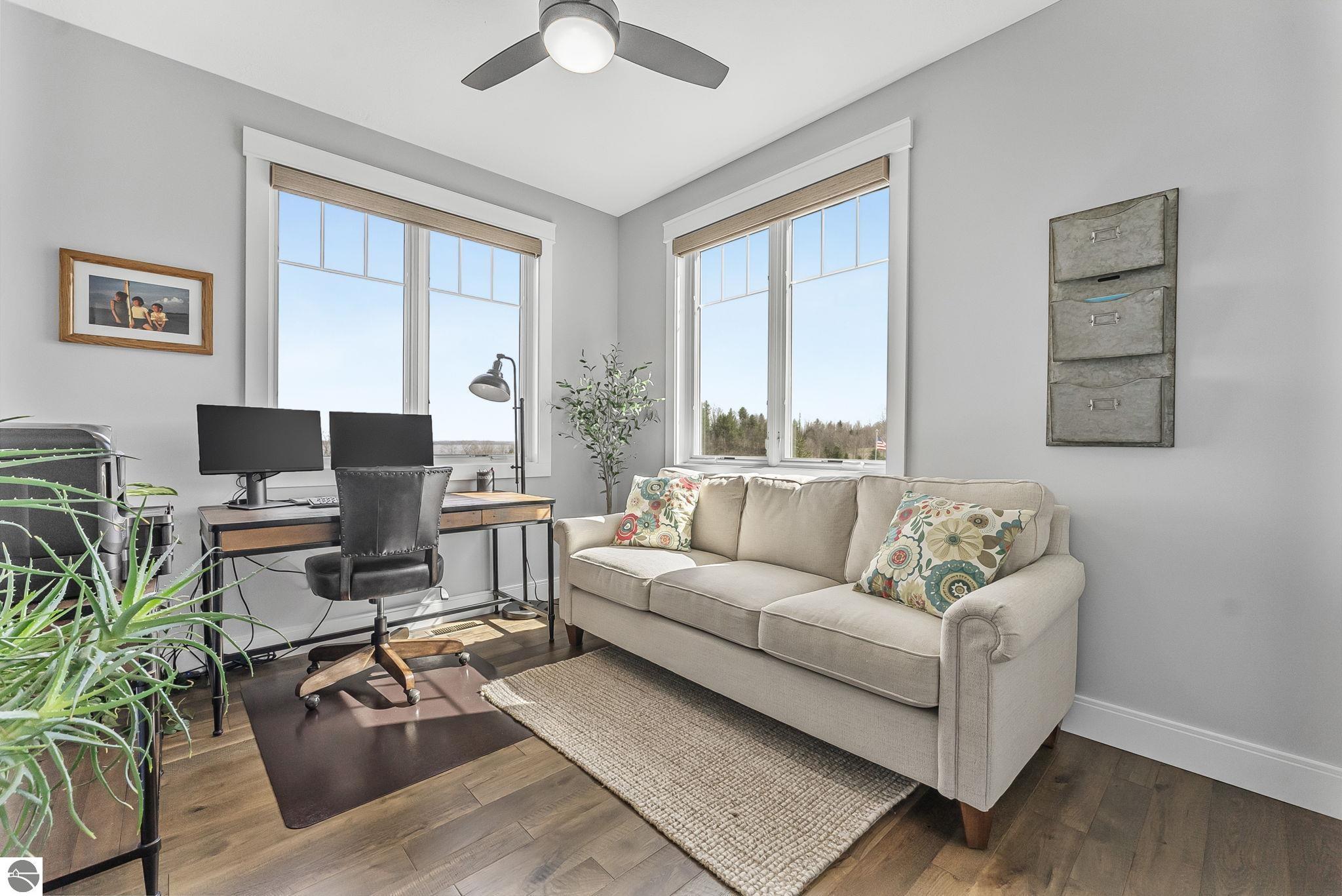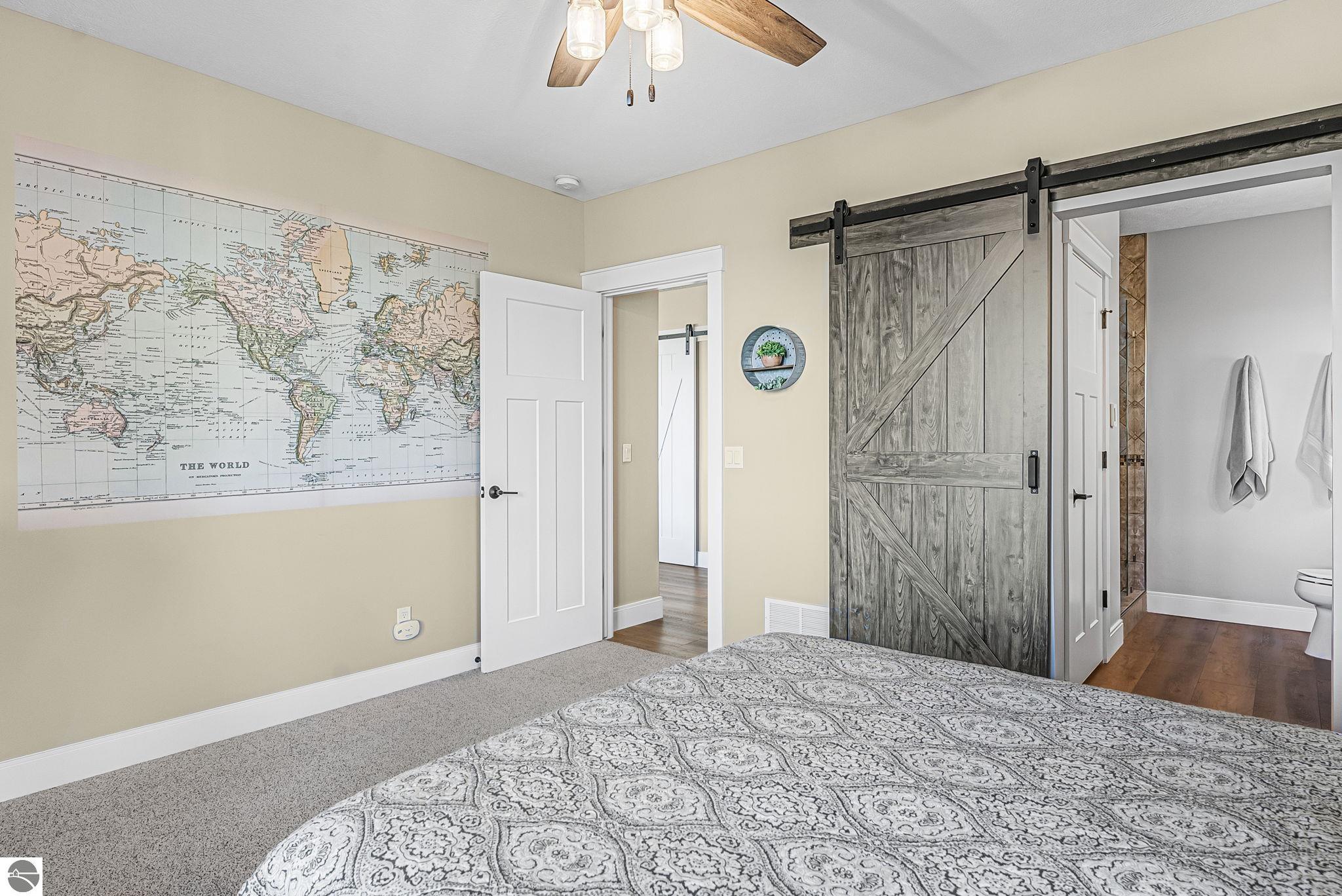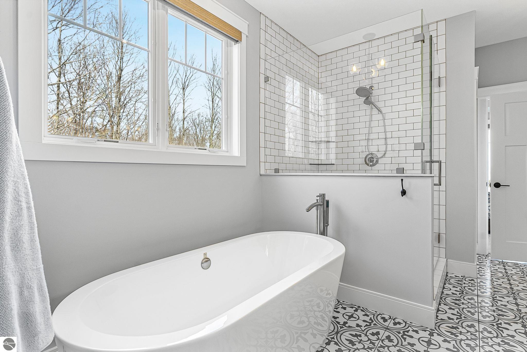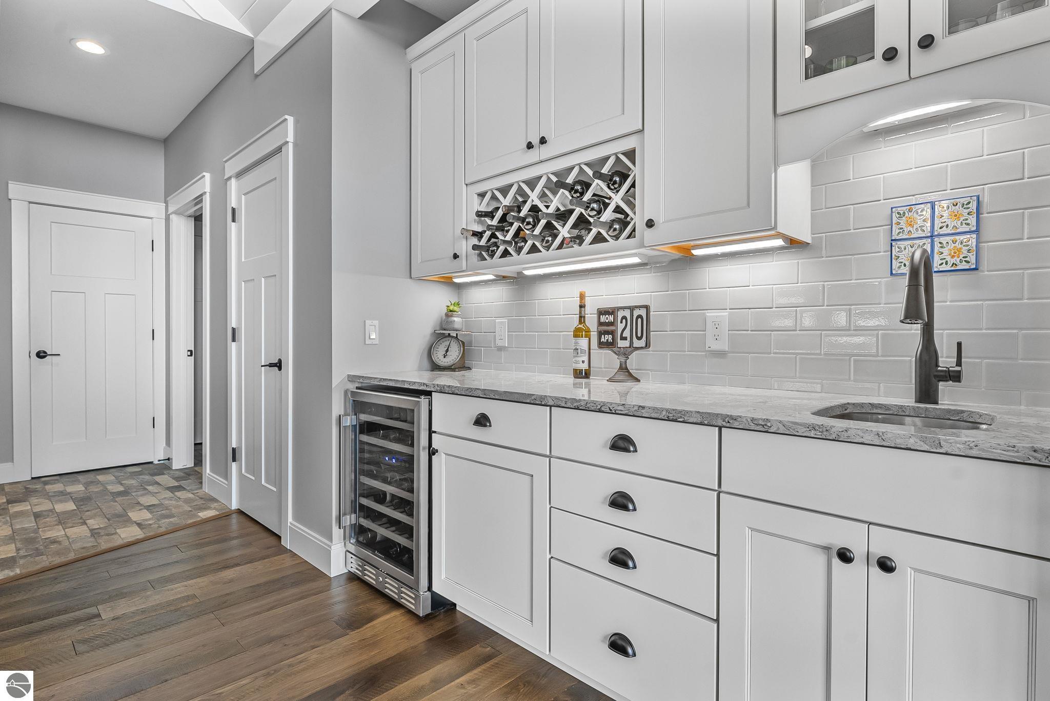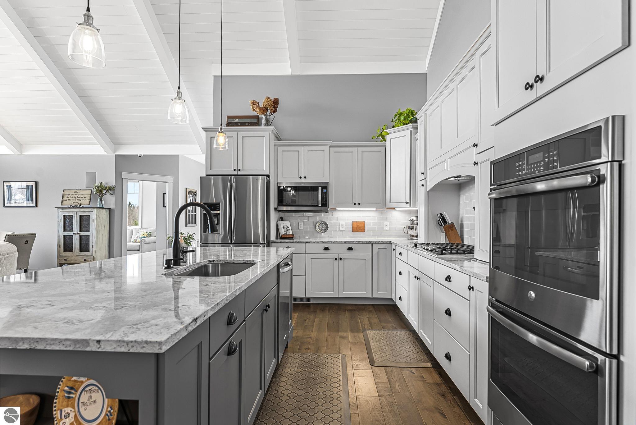 Breathtaking, unobstructed panoramic views of West Grand Traverse Bay and Power Island are showcased from the main living areas and all bedrooms in this custom Up North luxury home, ideally located just 10 minutes from Traverse City and Suttons Bay. Located in the sought-after Rolling Hills Estates subdivision, known for its collection of custom homes on spacious, well-appointed lots, the property offers convenient access to wineries, restaurants, breweries, and the Tart Trail. Situated on a 1.44-acre double parcel, the home features extensive professional landscaping representing a significant investment in thoughtfully designed outdoor living. Enjoy an immense wraparound Trex deck with privacy screen, a custom fire pit gathering area, and a beautiful paver patio off the walkout lower level, all positioned to take full advantage of the expansive bay views. The open-concept main level features vaulted shiplap ceilings with beams, expansive windows, hardwood flooring, and a chef’s kitchen with custom cabinetry, quartz countertops, and a walk-in pantry. Two gas fireplaces, located in the main living area and lower-level family room, provide warmth and ambiance. A fully integrated Control4 smart home system operates motorized blinds, lighting, sound, security system with cameras, thermostats, and garage doors. The walkout lower level includes a family room with surround sound, kitchenette, wine room, office, and three additional bedrooms, all designed to maximize comfort and flexibility. The home offers two en-suite bedrooms, including a main-level primary suite with a freestanding tub, walk-in shower, and heated floors, with heated floors also featured in the additional en-suite bath. The heated garage is fully finished with epoxy flooring, custom built-ins, and detailed trim work, plus hot and cold water. Additional features include Hardie Plank siding, Pella casement windows, dual-zone furnace, Generac, and a 12x14 custom shed. Measurements are estimated.