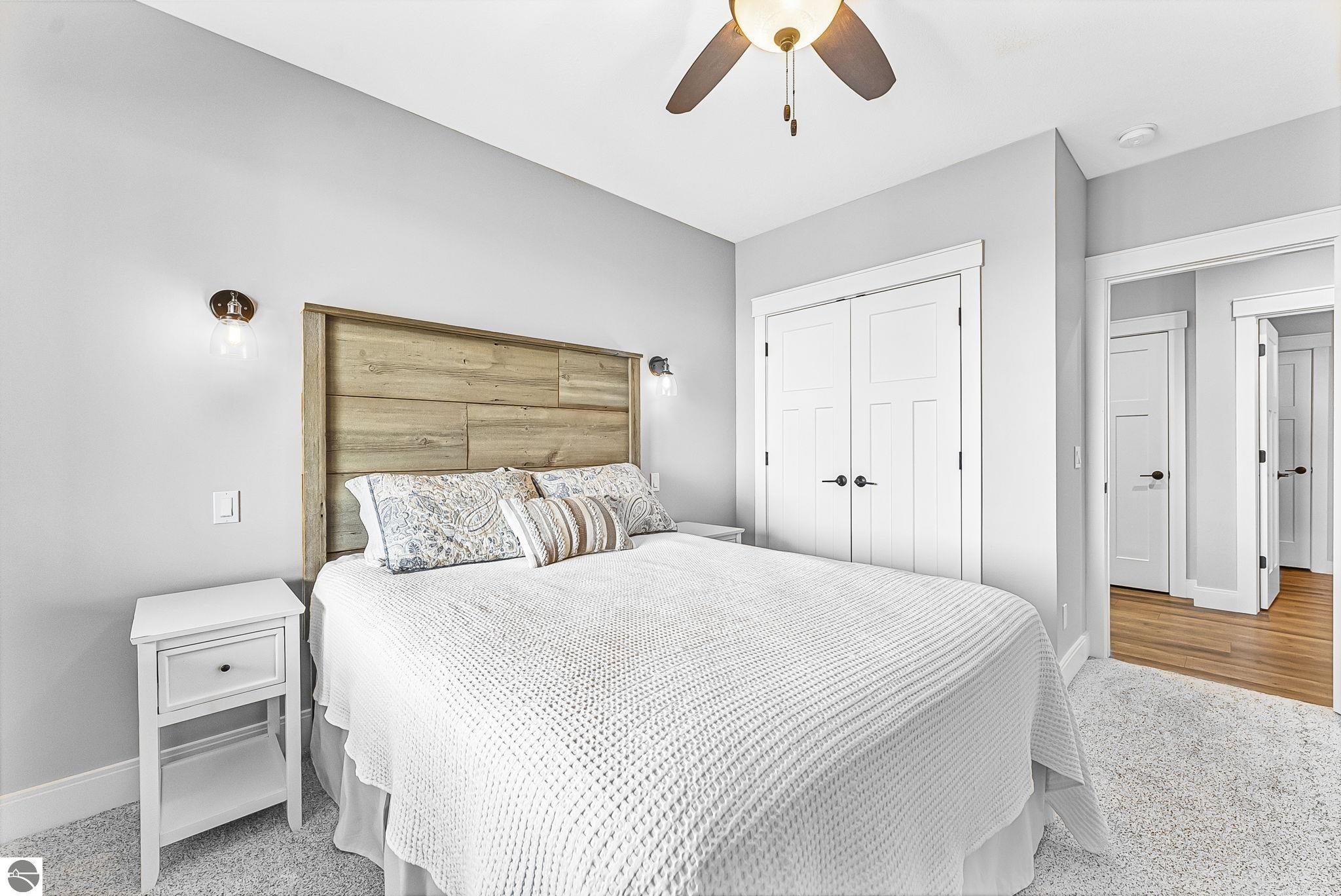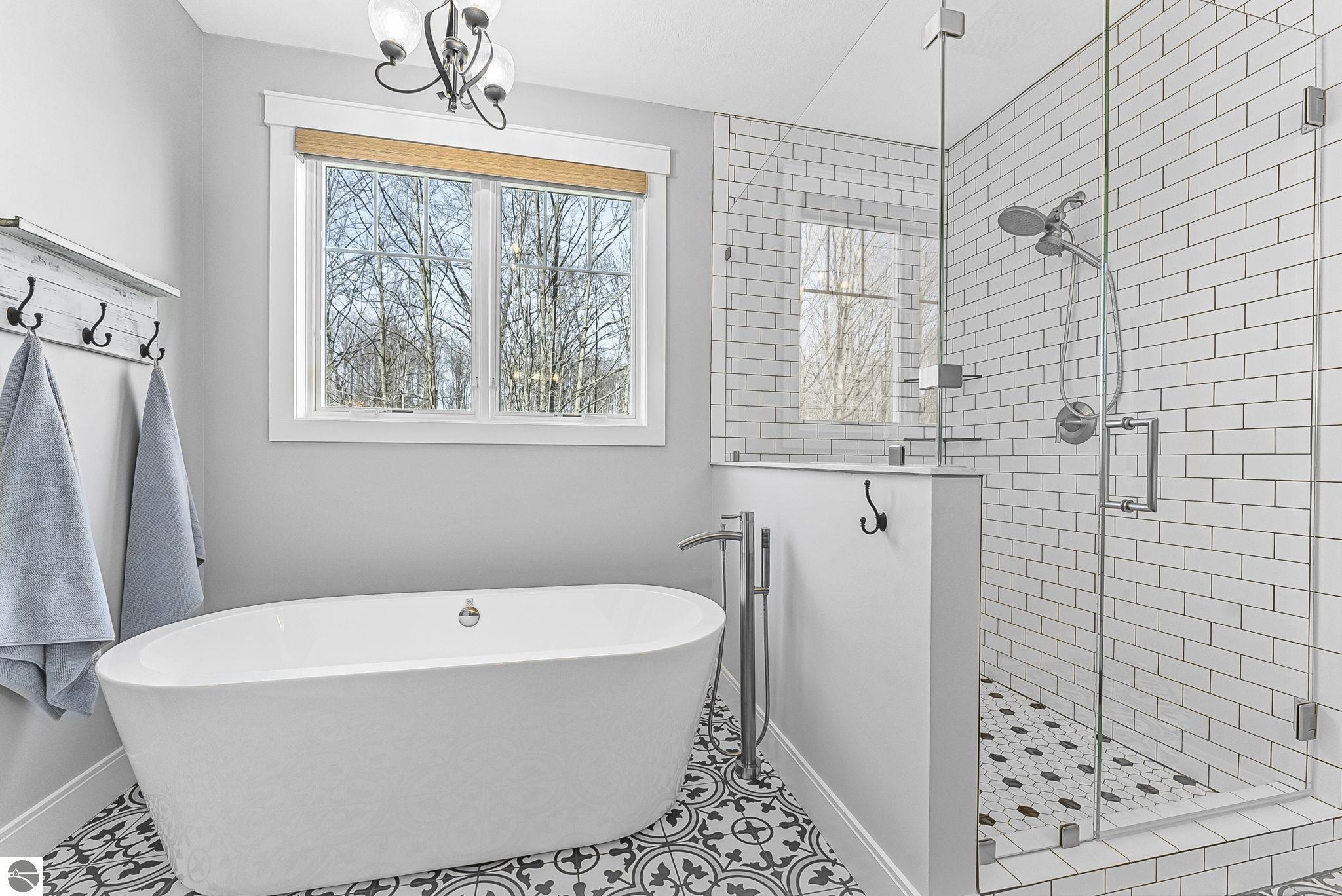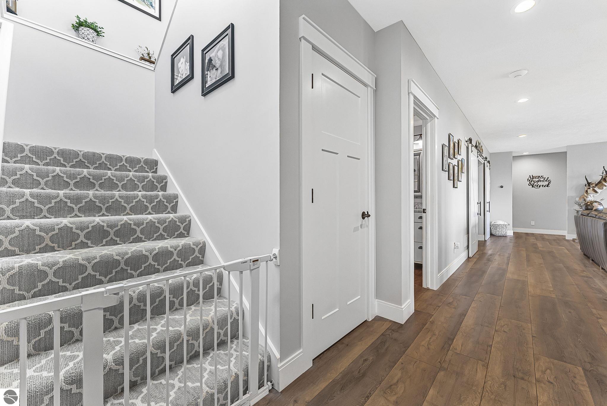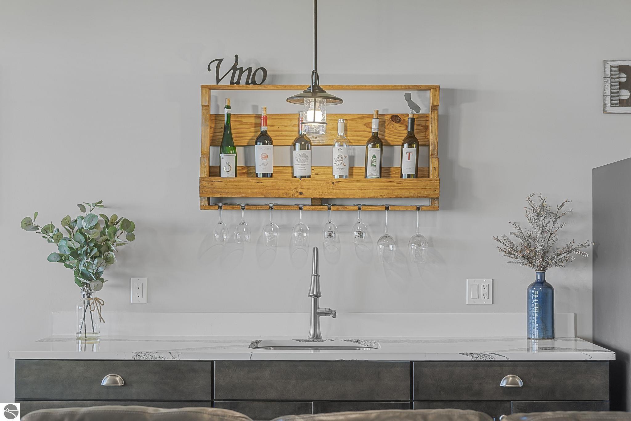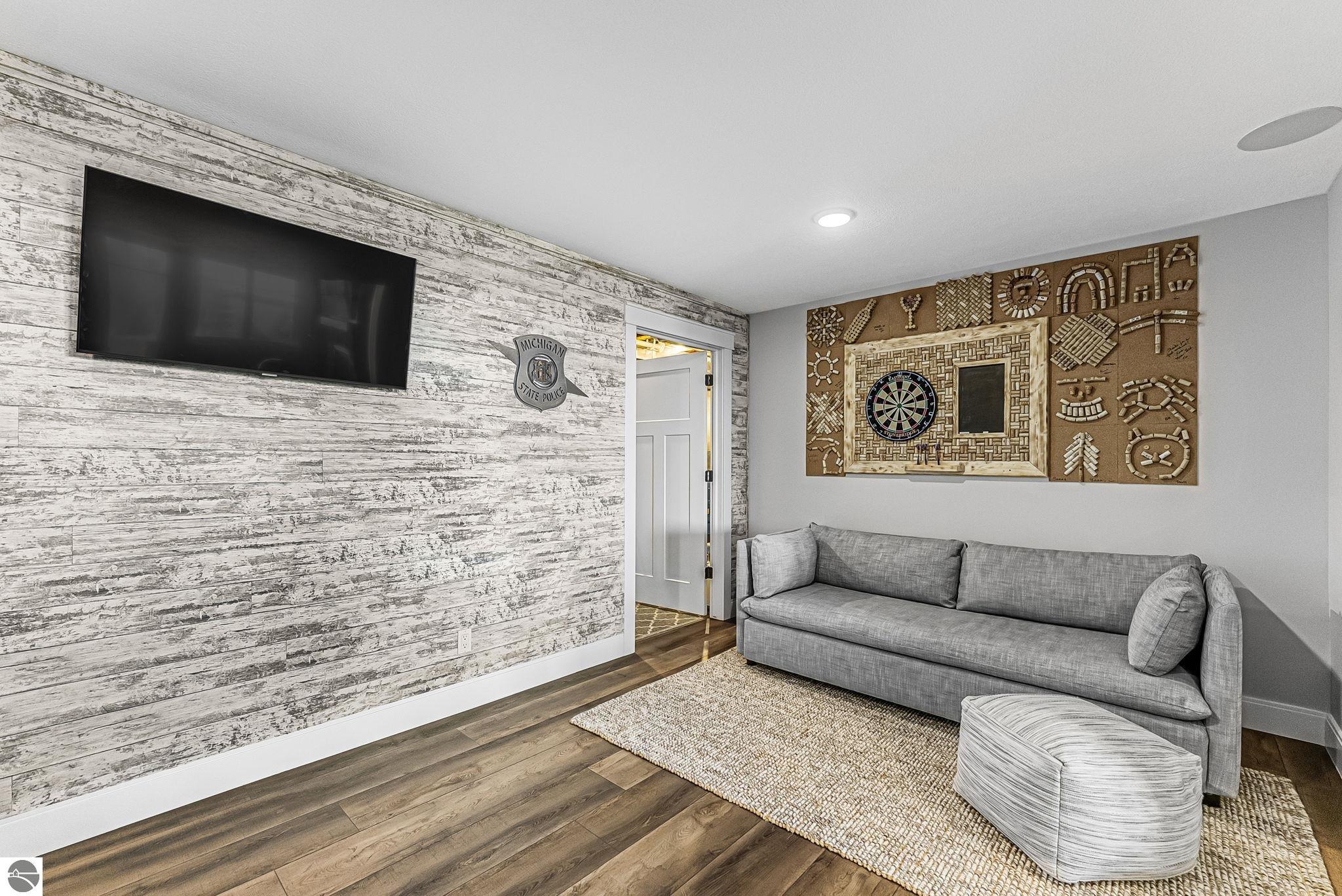 Breathtaking, unobstructed panoramic views of West Grand Traverse Bay and Power Island are showcased from the main living areas and all bedrooms in this custom Up North luxury home, ideally located just 10 minutes from Traverse City and Suttons Bay. Located in the sought-after Rolling Hills Estates subdivision, known for its collection of custom homes on spacious, well-appointed lots, the property offers convenient access to wineries, restaurants, breweries, and the Tart Trail. Situated on a 1.44-acre double parcel, the home features extensive professional landscaping representing a significant investment in thoughtfully designed outdoor living. Enjoy an immense wraparound Trex deck with privacy screen, a custom fire pit gathering area, and a beautiful paver patio off the walkout lower level, all positioned to take full advantage of the expansive bay views. The open-concept main level features vaulted shiplap ceilings with beams, expansive windows, hardwood flooring, and a chef’s kitchen with custom cabinetry, quartz countertops, and a walk-in pantry. Two gas fireplaces, located in the main living area and lower-level family room, provide warmth and ambiance. A fully integrated Control4 smart home system operates motorized blinds, lighting, sound, security system with cameras, thermostats, and garage doors. The walkout lower level includes a family room with surround sound, kitchenette, wine room, office, and three additional bedrooms, all designed to maximize comfort and flexibility. The home offers two en-suite bedrooms, including a main-level primary suite with a freestanding tub, walk-in shower, and heated floors, with heated floors also featured in the additional en-suite bath. The heated garage is fully finished with epoxy flooring, custom built-ins, and detailed trim work, plus hot and cold water. Additional features include Hardie Plank siding, Pella casement windows, dual-zone furnace, Generac, and a 12x14 custom shed. Measurements are estimated.