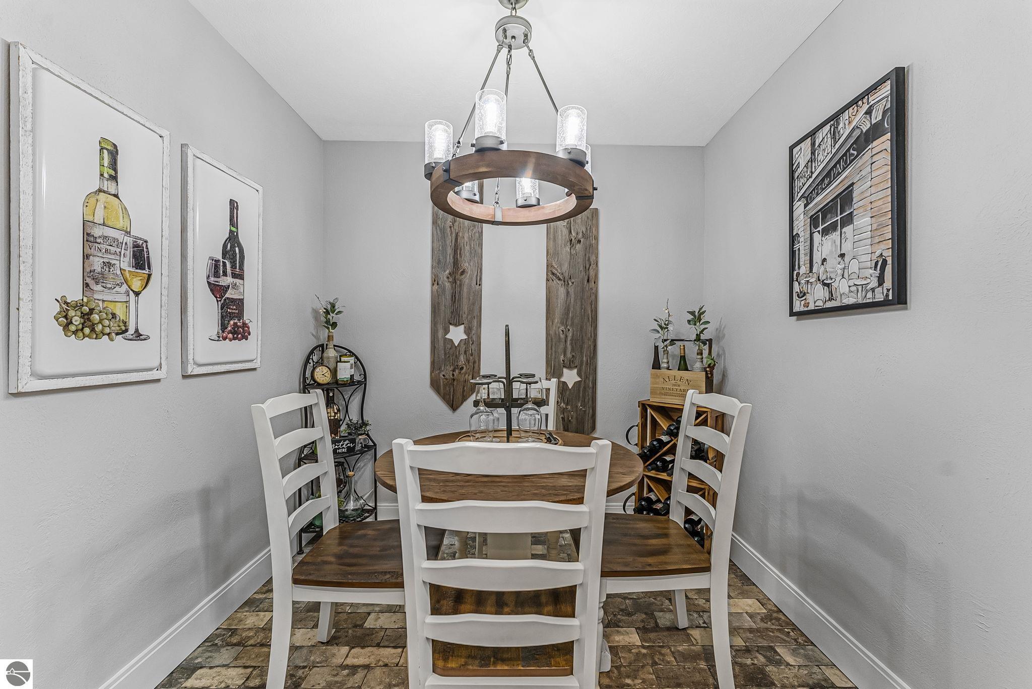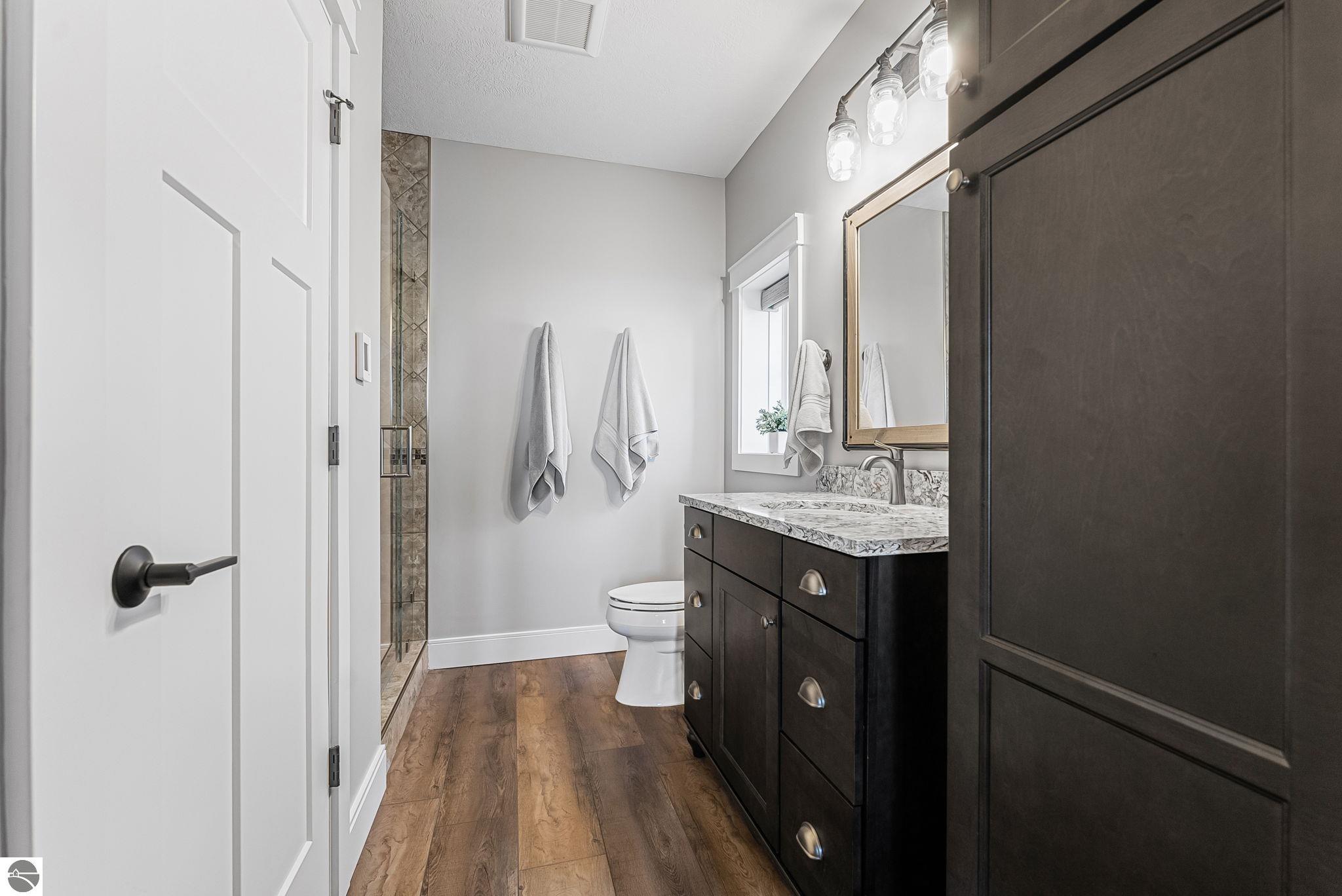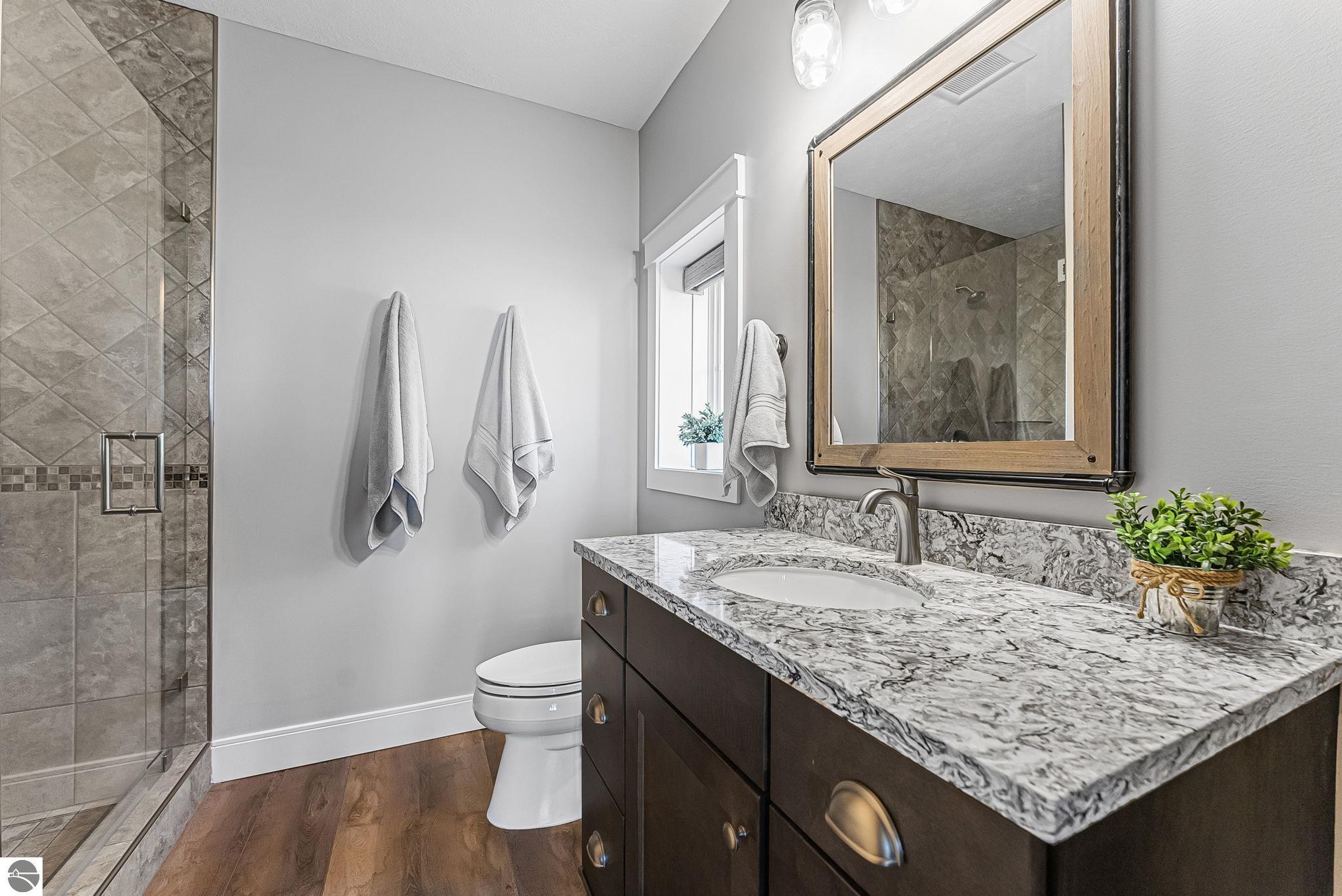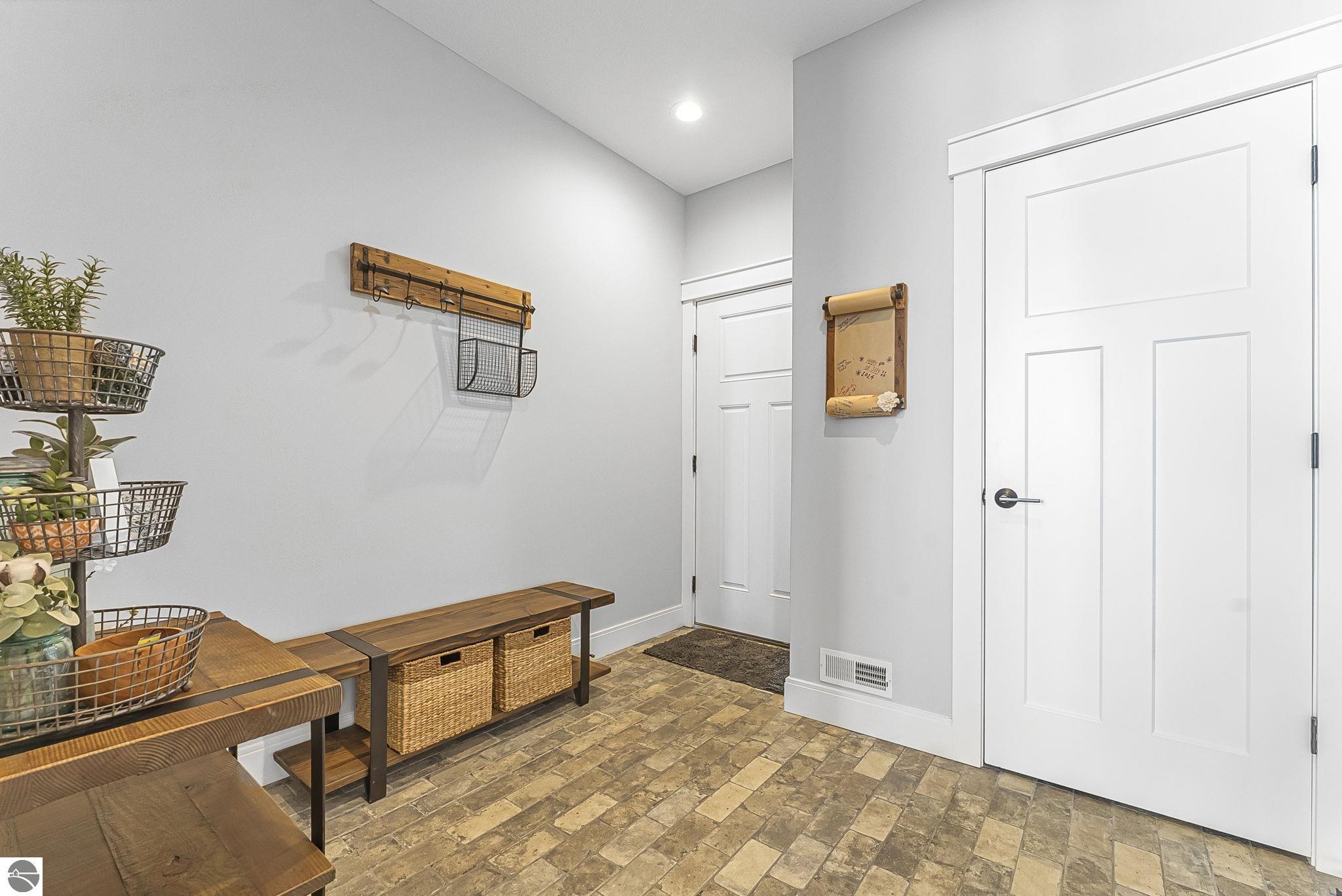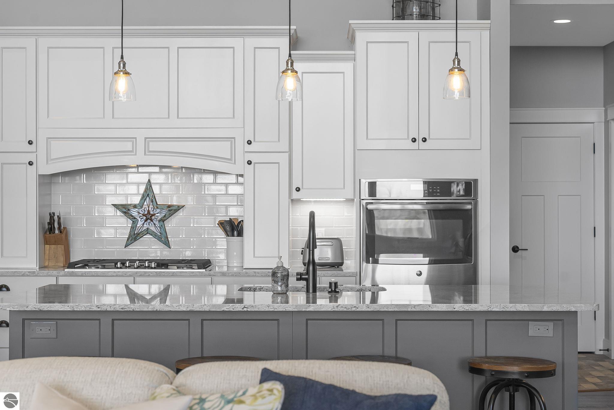 Breathtaking, unobstructed panoramic views of West Grand Traverse Bay and Power Island are showcased from the main living areas and all bedrooms in this custom Up North luxury home, ideally located just 10 minutes from Traverse City and Suttons Bay. Located in the sought-after Rolling Hills Estates subdivision, known for its collection of custom homes on spacious, well-appointed lots, the property offers convenient access to wineries, restaurants, breweries, and the Tart Trail. Situated on a 1.44-acre double parcel, the home features extensive professional landscaping representing a significant investment in thoughtfully designed outdoor living. Enjoy an immense wraparound Trex deck with privacy screen, a custom fire pit gathering area, and a beautiful paver patio off the walkout lower level, all positioned to take full advantage of the expansive bay views. The open-concept main level features vaulted shiplap ceilings with beams, expansive windows, hardwood flooring, and a chef’s kitchen with custom cabinetry, quartz countertops, and a walk-in pantry. Two gas fireplaces, located in the main living area and lower-level family room, provide warmth and ambiance. A fully integrated Control4 smart home system operates motorized blinds, lighting, sound, security system with cameras, thermostats, and garage doors. The walkout lower level includes a family room with surround sound, kitchenette, wine room, office, and three additional bedrooms, all designed to maximize comfort and flexibility. The home offers two en-suite bedrooms, including a main-level primary suite with a freestanding tub, walk-in shower, and heated floors, with heated floors also featured in the additional en-suite bath. The heated garage is fully finished with epoxy flooring, custom built-ins, and detailed trim work, plus hot and cold water. Additional features include Hardie Plank siding, Pella casement windows, dual-zone furnace, Generac, and a 12x14 custom shed. Measurements are estimated.