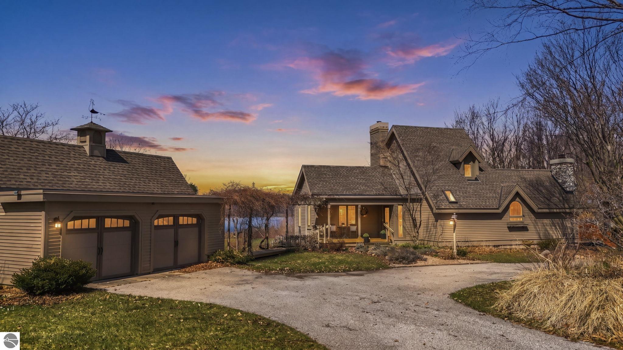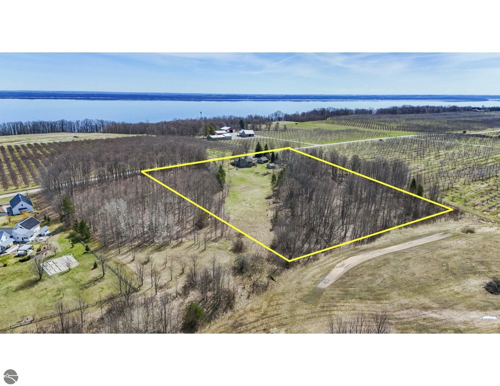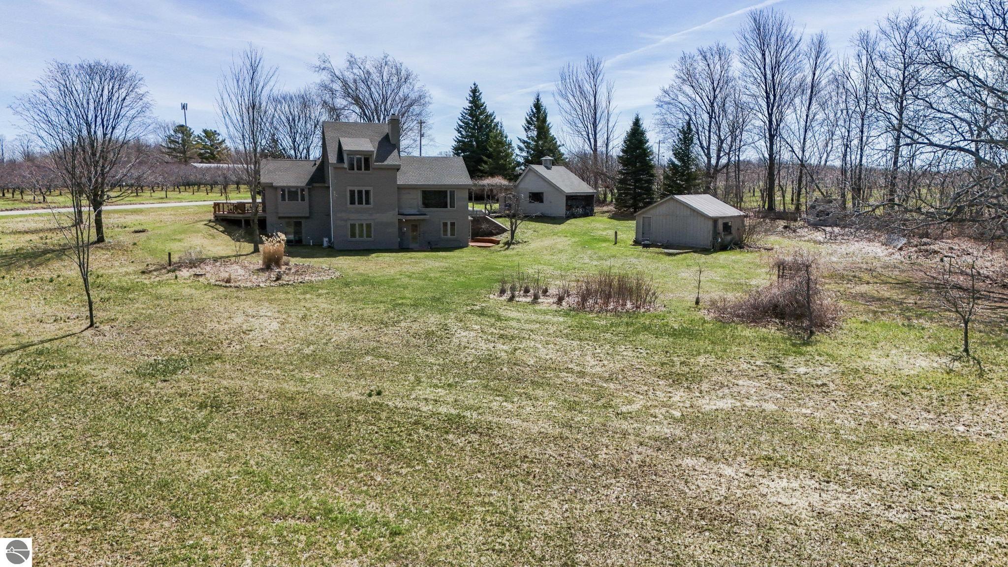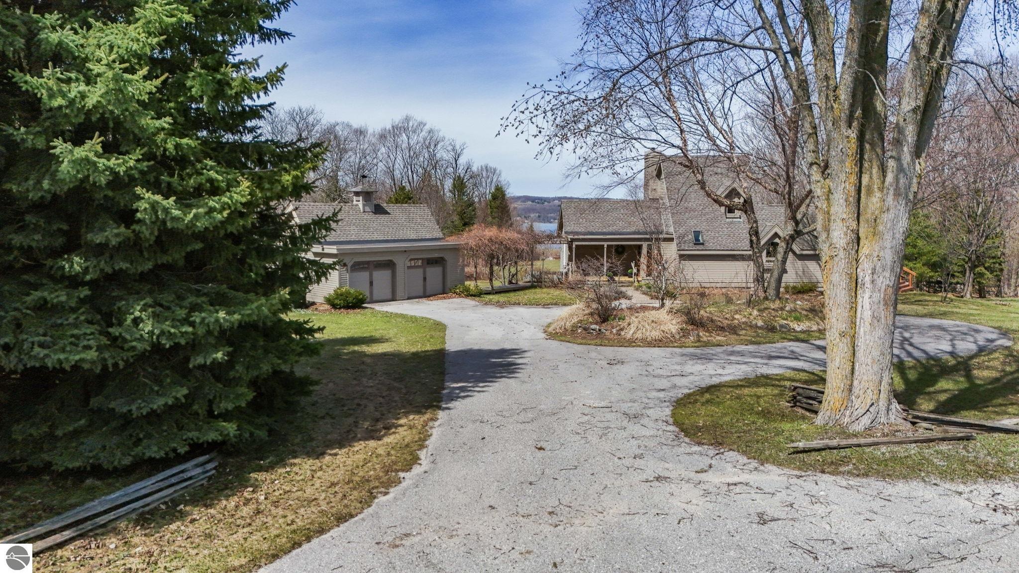 Picturesque contemporary 3 bed 2 1/2 bath home perfectly positioned on over 6 1/2 tree lined acres with stellar views of both Suttons and West Bay. Quaint front porch w/ Grapevine covered breezeway overlooks orchards in all directions. Expansive modern farmhouse kitchen offers an abundance of counter space and cabinets. Custom built-in Banquette is perfect for conversations & coffee. Wood-burning fireplace completes this cozy spot in the perfect kitchen. The open and airy dining room features built-ins, and spectacular views-truly an ideal gathering space. The stylish living room is flooded with natural light &, unique architectural details like full wall customized built-ins, vaulted ceiling & floating fireplace hearth. The expansive picture window frames the best view of the bay! The upper level primary en suite has a storybook feel with built-ins, secluded loft with desk, refreshed, full bath and generously sized closet. The lower level family room offers the perfect respite from lazy summer days. Two spacious bedrooms, complete laundry center (flex space-kitchenette) & gorgeous remodeled full bath. Convenient mudroom with access to the backyard. This property is breathtaking with glorious views from every direction. Two out buildings allow space for storage and a potting shed with sink-perfect for the master gardener! Picket fence adds charm to this unique outdoor setting. A 2 car garage w/ breezeway to the house completes this perfect retreat.